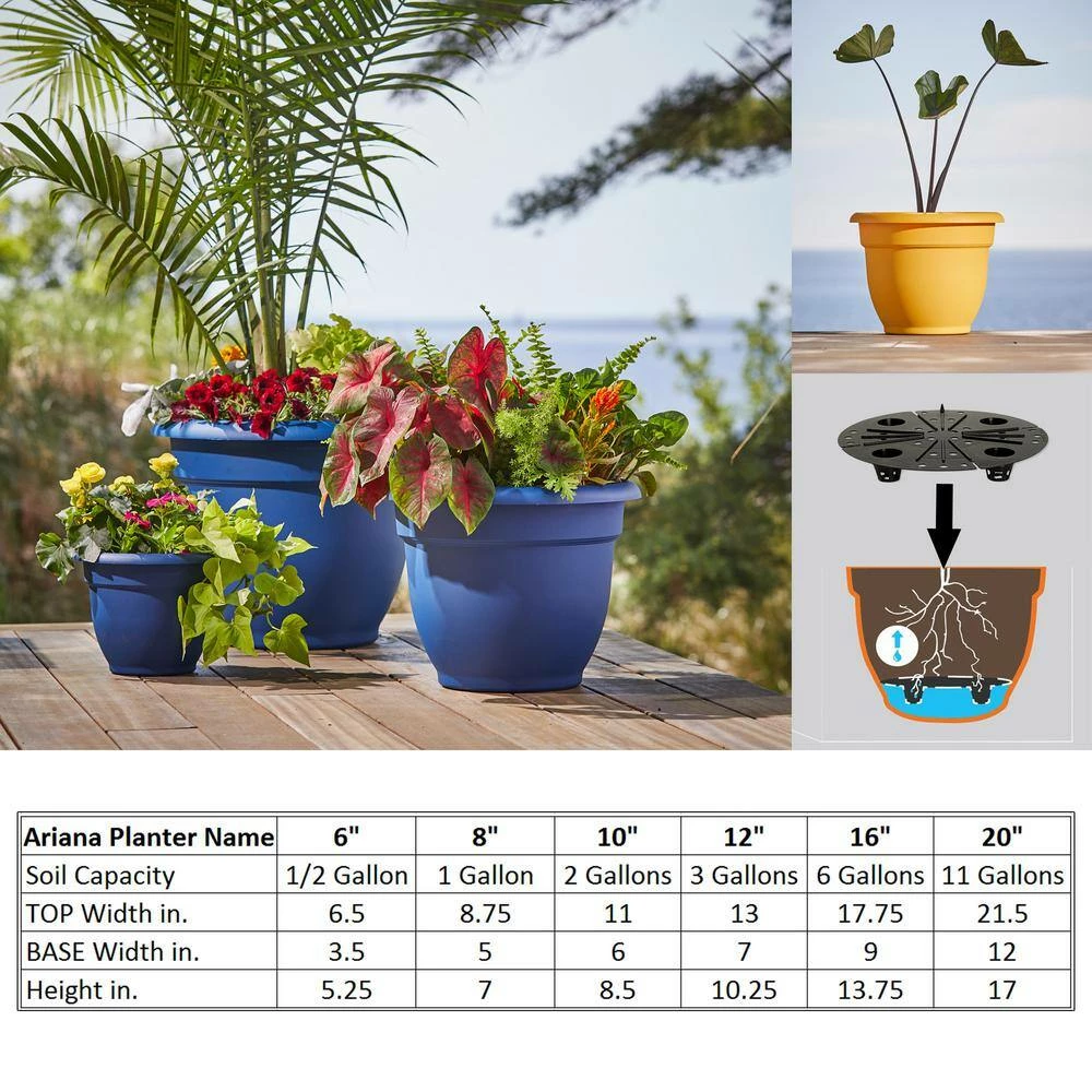 Ariana Collection by Bloem: The Ariana planter will quickly become one of your favorite pots because it helps keep your plants from drying out and will reduce the time you spend watering. Inside the planter is a hidden reservoir located at the bottom of your pot that holds approx. 1″-3.5″ water (depending on planter size). This self-watering insert keeps dirt and roots above the hidden reservoir line while constantly providing healthy “greenhouse-like” moisture through the evaporation process. If you’re forgetful, or you’re just not home very often, self-watering containers are a must-have. They’re also helpful if you’re growing in an area that’s not convenient to a water spigot, such as a balcony. How a Self-Watering Planter Works: Inside Bloem’s self-watering planter, the potting mix is held above the water line by a sturdy screen. The water chamber is connected by small porous channel filled with soil, which then acts as a wick. As water is used by the plant or evaporates from the surface of the soil, capillary action draws more water up from below. The soil has just the right amount of water all the time, but also maintains air pockets, which the plant roots need to stay healthy.