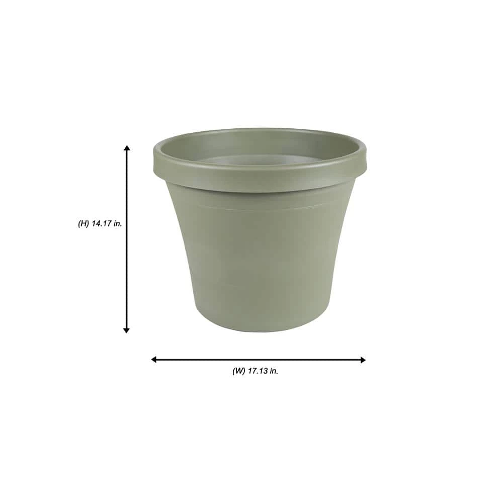 Dress up your gardening style with this tapered style resin planter. A perfect alternative to clay or ceramic pots, it features natural textures and decorative embellishments that add a lovely accent to your existing decor. The textured finish mimics the appearance of natural clay. It comes with pre-drilled drainage holes to prevent overwatering, promoting plant root health. The container includes thick walls and a rolled lip for enhanced durability. This all-weather planter is made from high-quality color pigments and UV additives to prevent fading and cracking. It comes in a variety of sizes and colors, and bloem saucers and caddies for this planter are sold separately. Enjoy indoors or outdoors. Total dimensions: 14.17 x 17.13 x 17.13; Size 16 in.; Color: Living Green; Material: high-quality plastic resin.