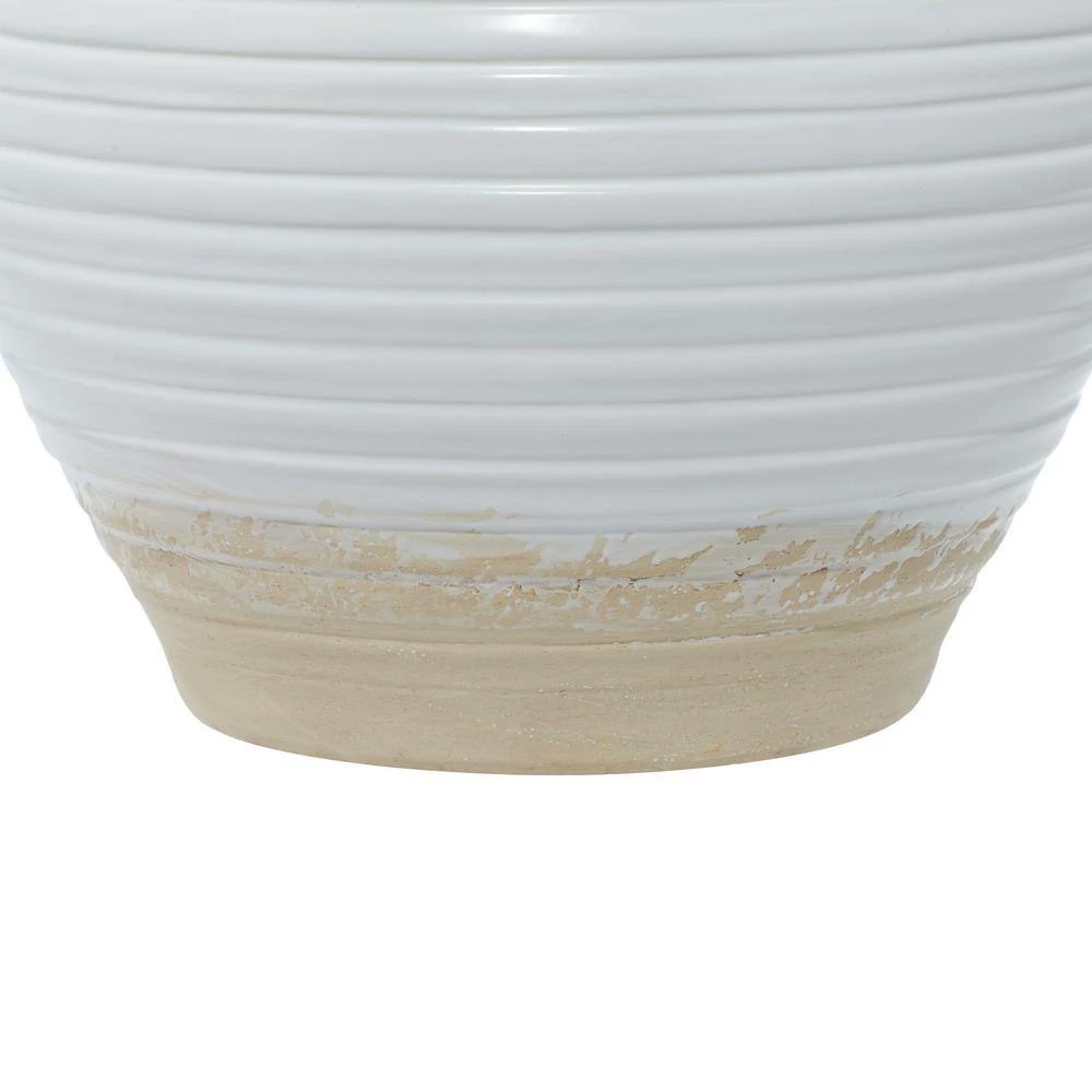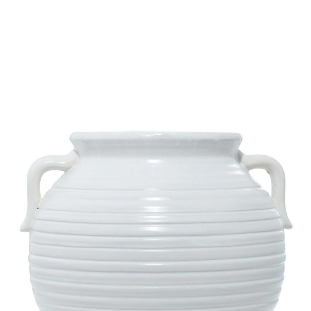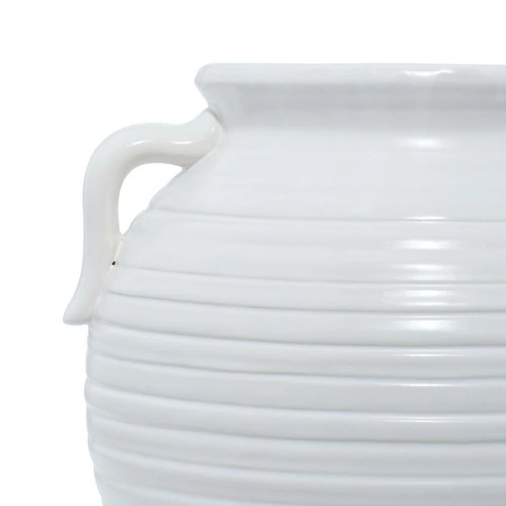 - This accent piece features a round body with side pot handles, designed with horizontal ribbing