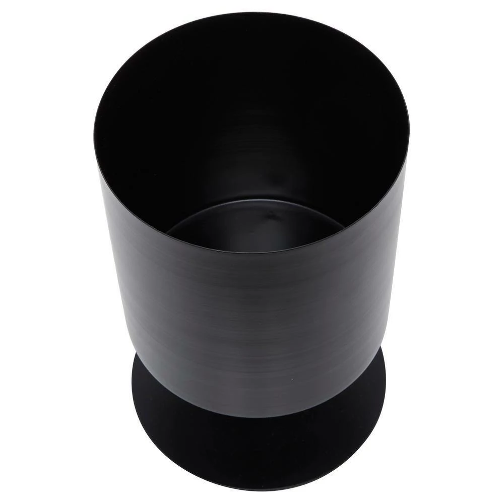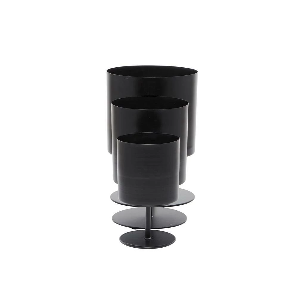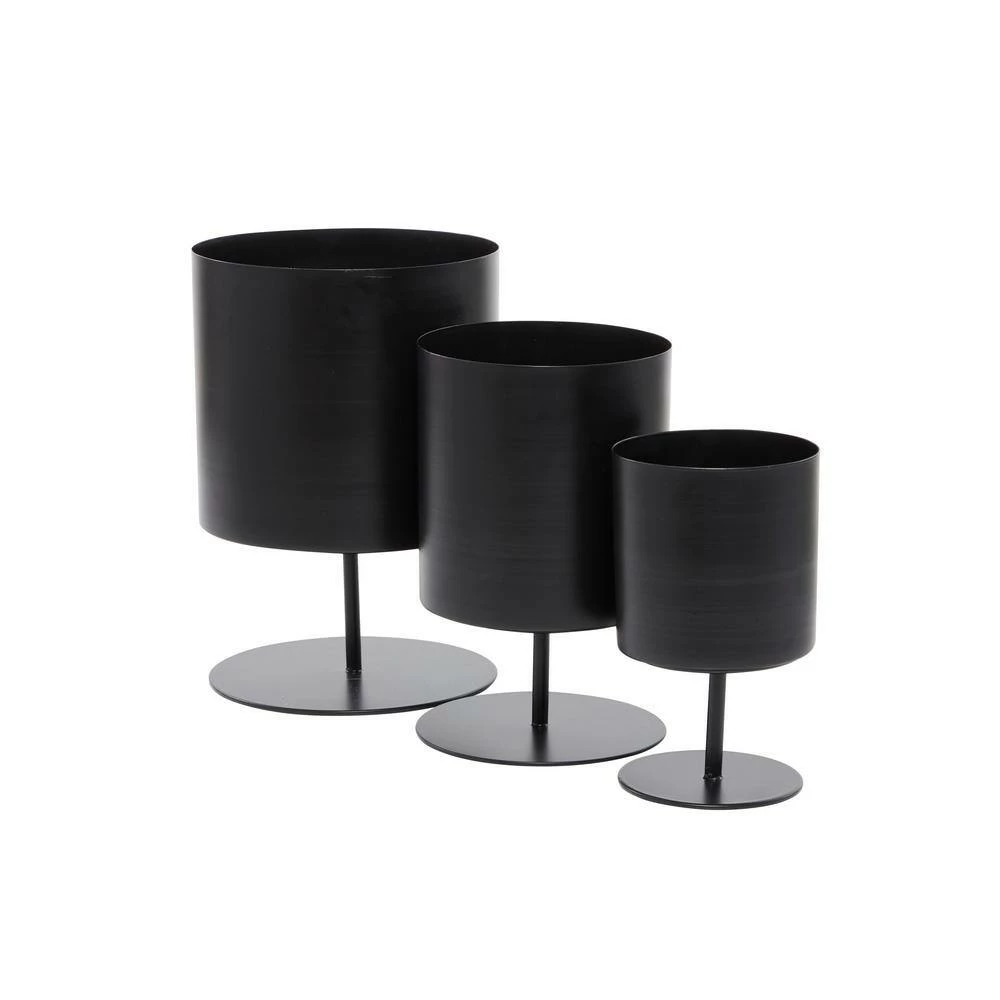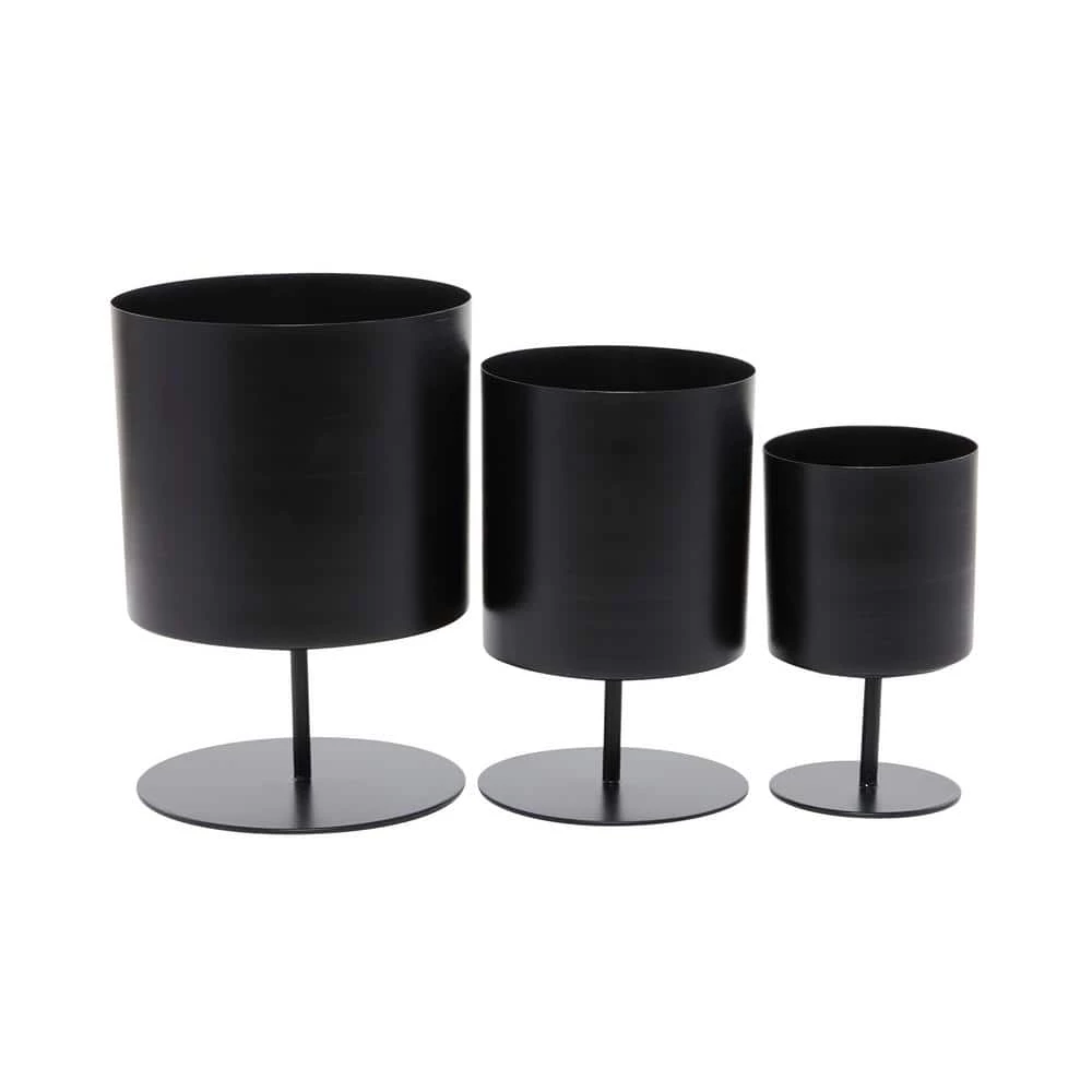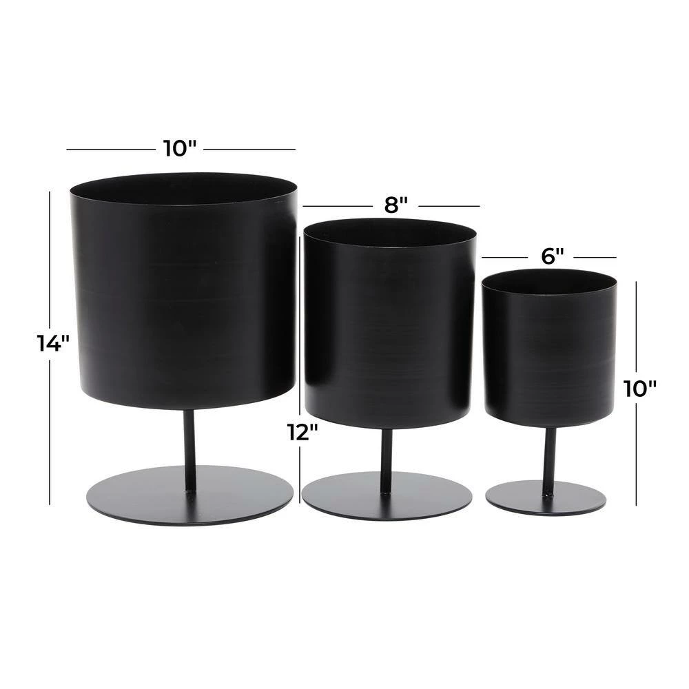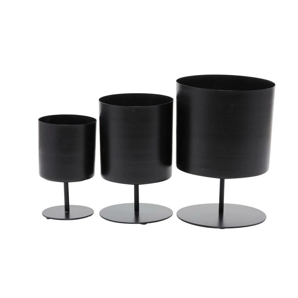 - These black planters feature cylindrical pots with deep setting, thin metal stands, and flat round bases