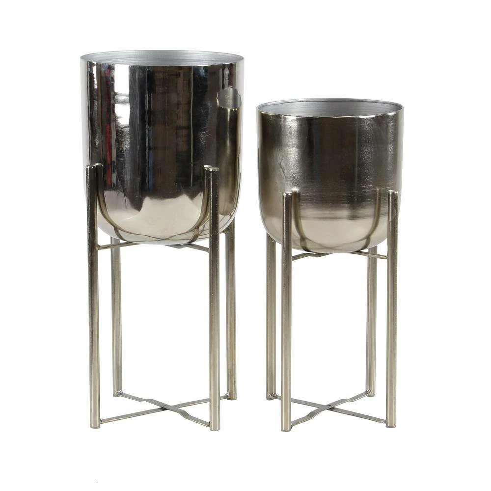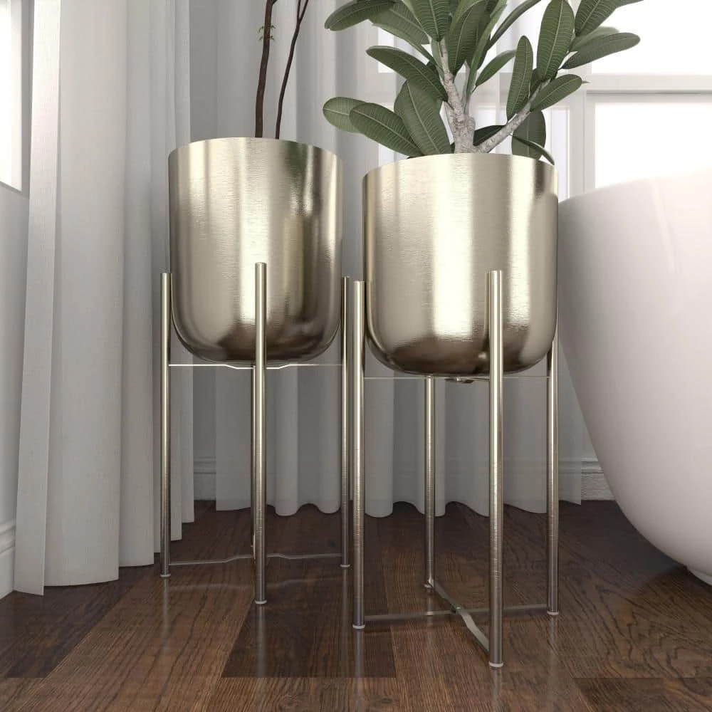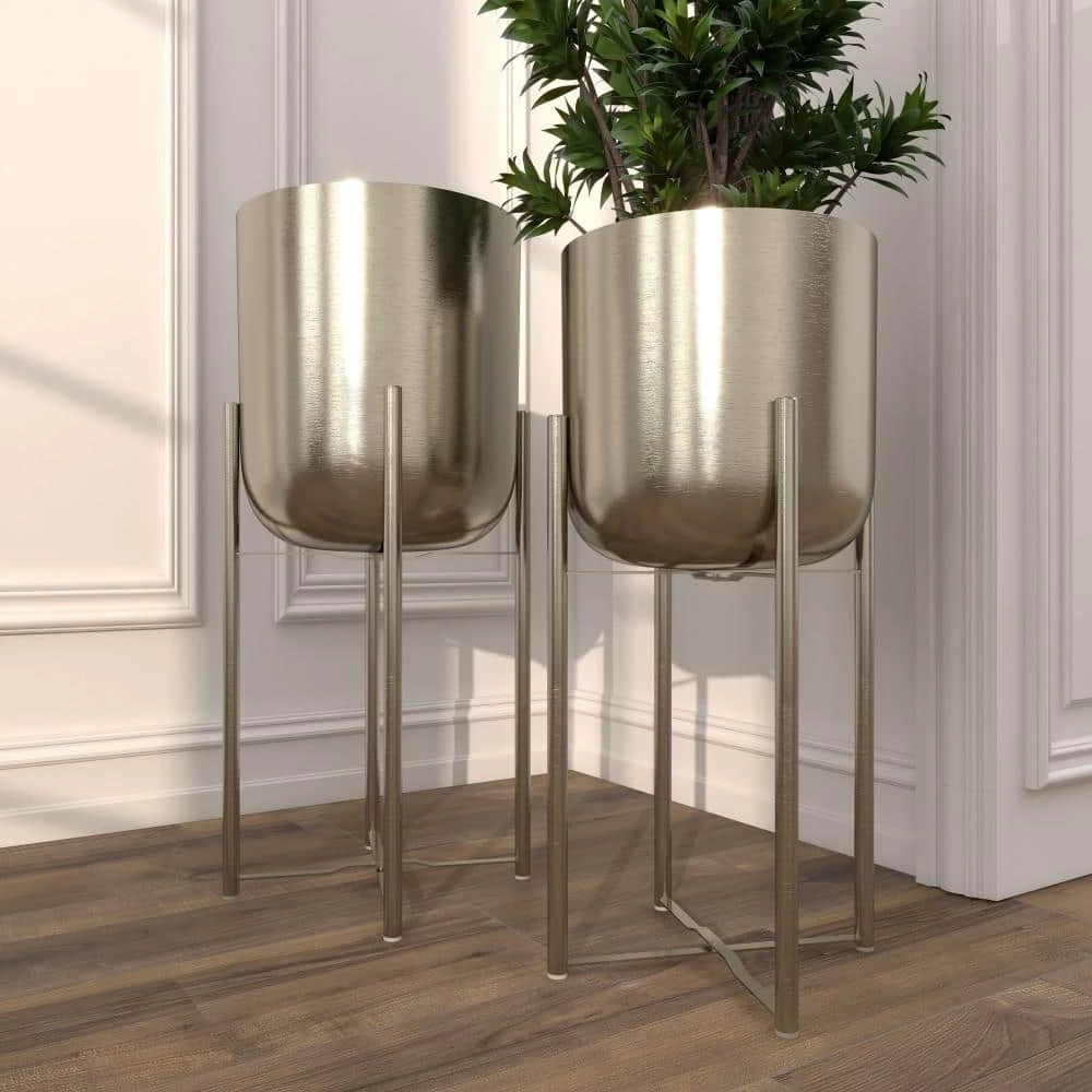 These stylish planters with stands are safe in any weather, so you can display botanicals on the porch, patio, or greenhouse garden. However, they are best appreciated indoors, in empty room corners. This item ships in 1 carton. Suitable for indoor and outdoor use. Made in India. Planters do not have drainage holes but they are not watertight. Each set comes with 2 floor planters with stands. Glam style.