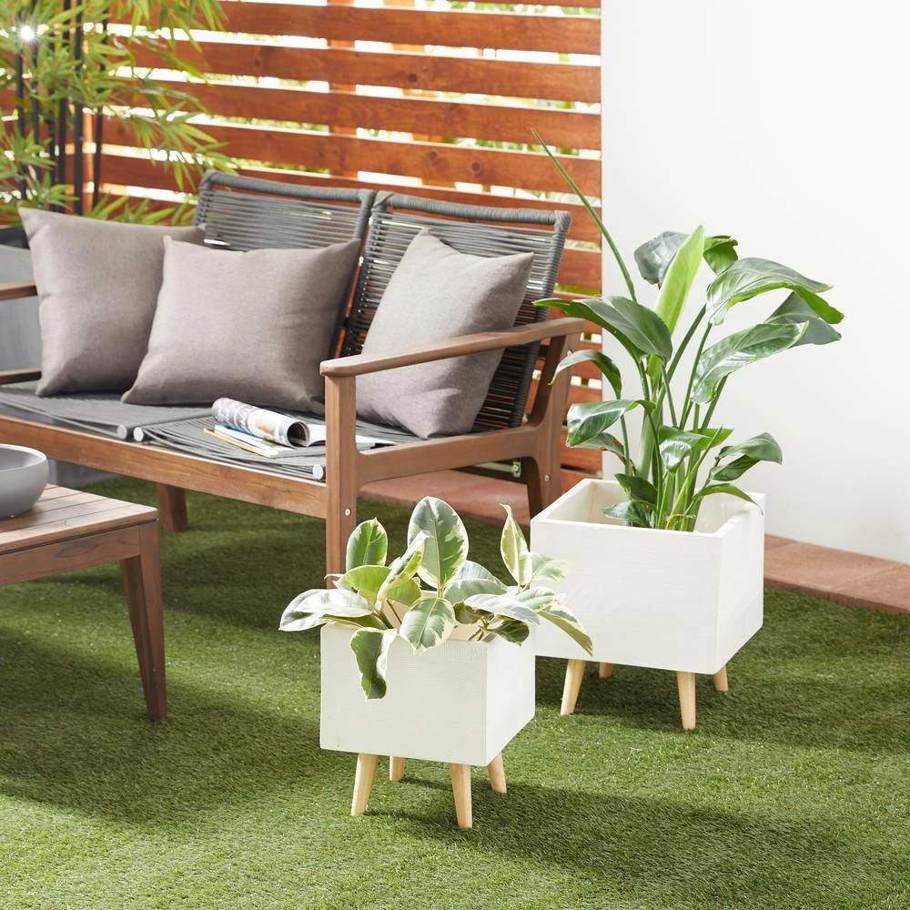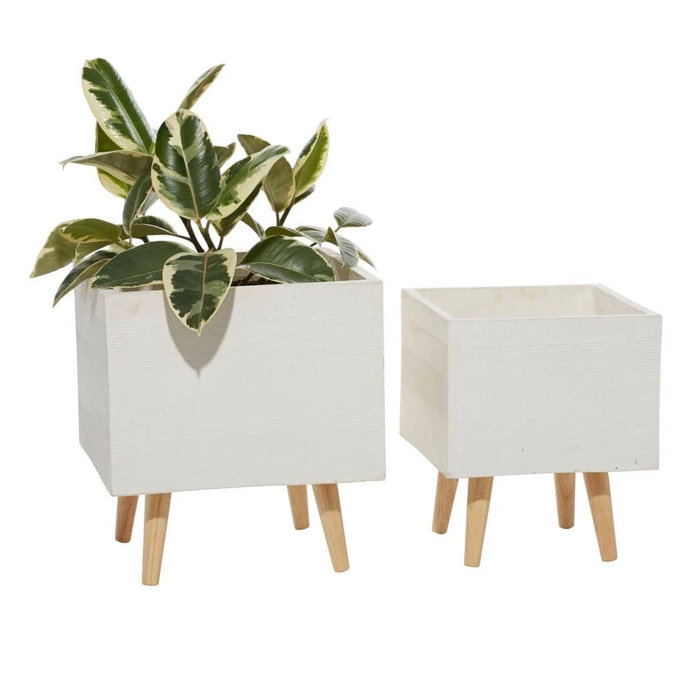 - Highlights an ivory white planter finish with natural wood brown leg stands