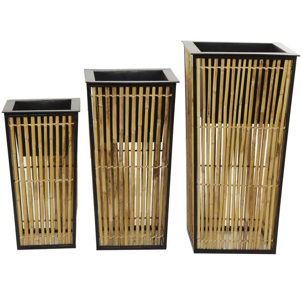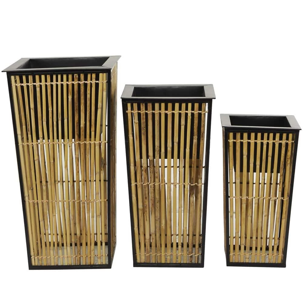 - Set of 3 planters feature square metal containers mounted on tall trapezoidal wooden bodies, with spaces on the bottom for a unique style