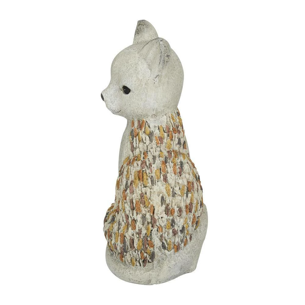 - This playful cat garden statue features a textured white stone finish designed with multi-colored fiberglass stones in orange, black, yellow, and maroon