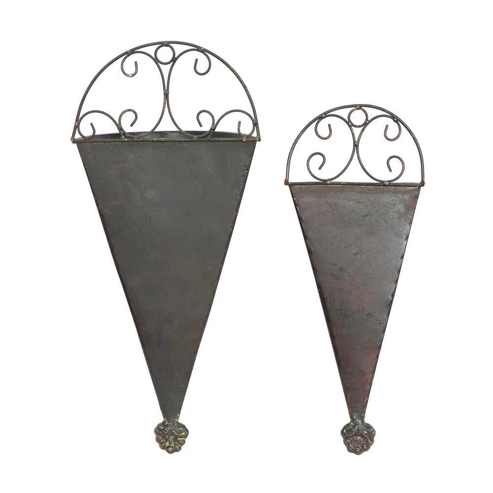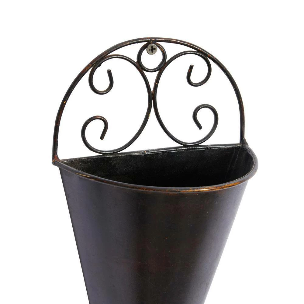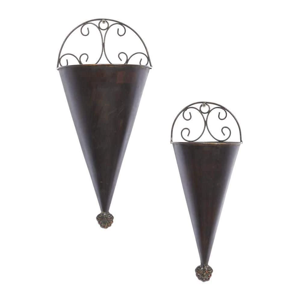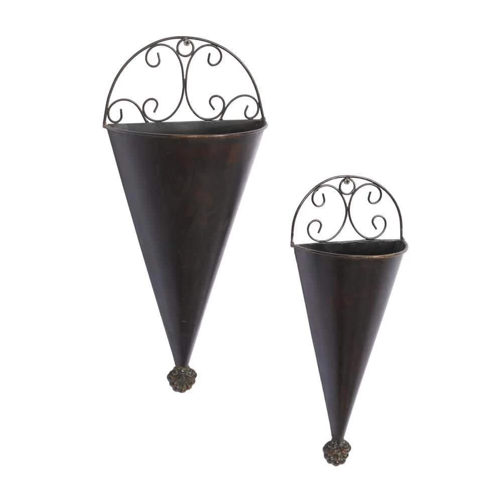 - Features cone-shaped planters with scrolled metal accents on top, designed with textured black finish