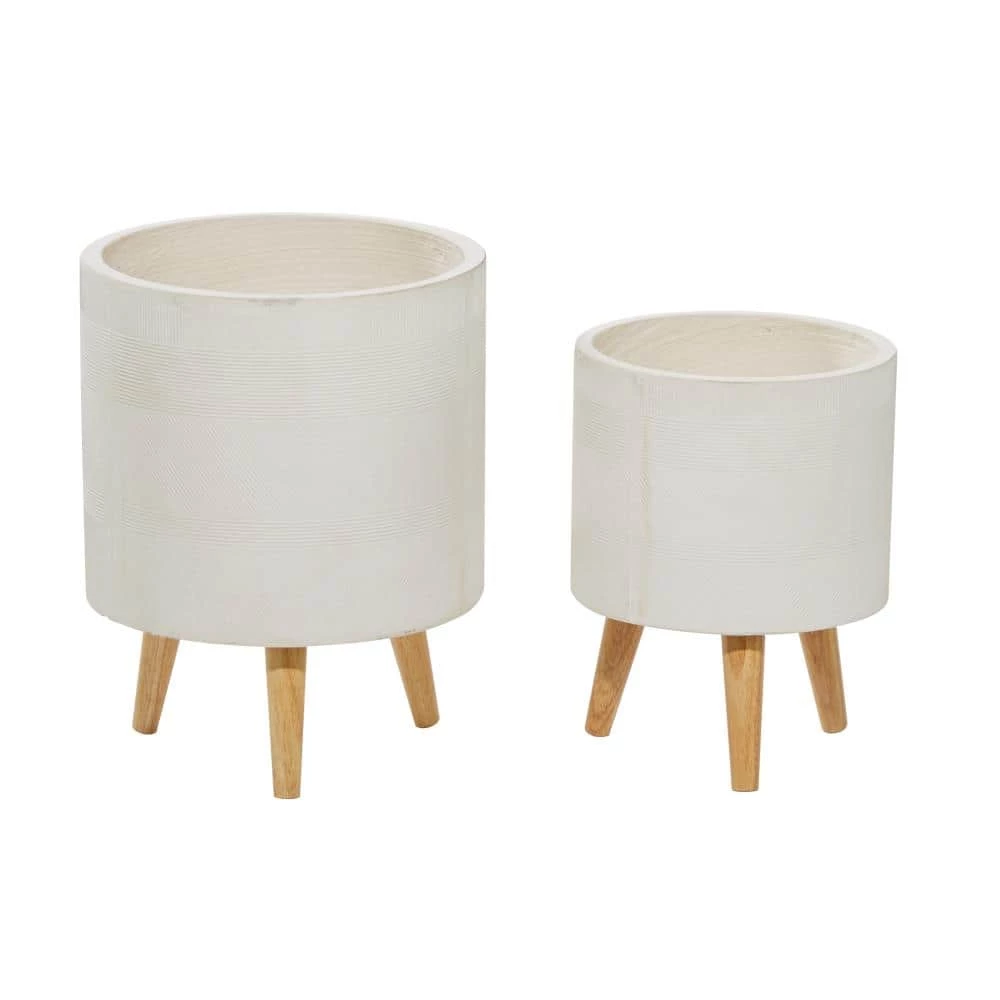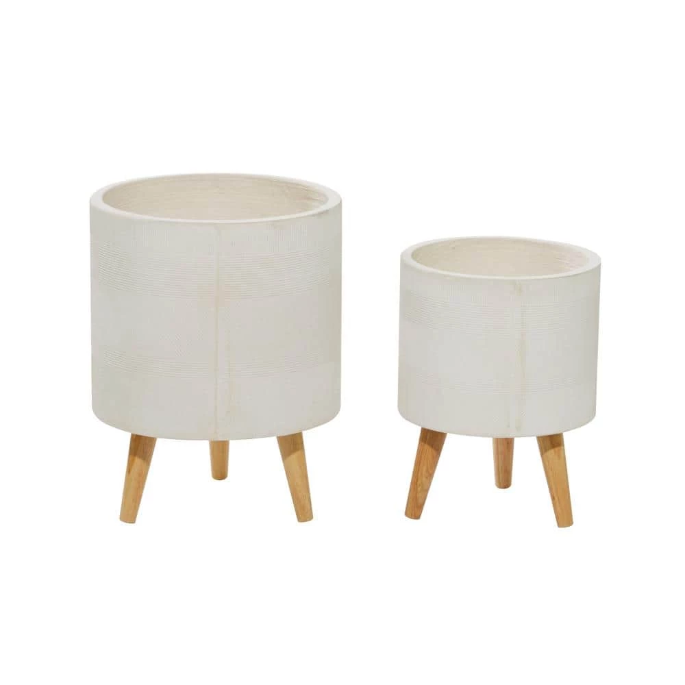 - A matte white planters with natural toned wooden legs and subtle line texture