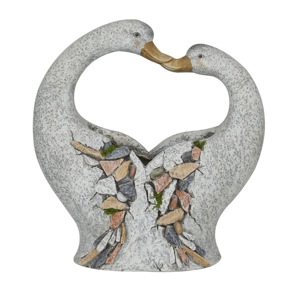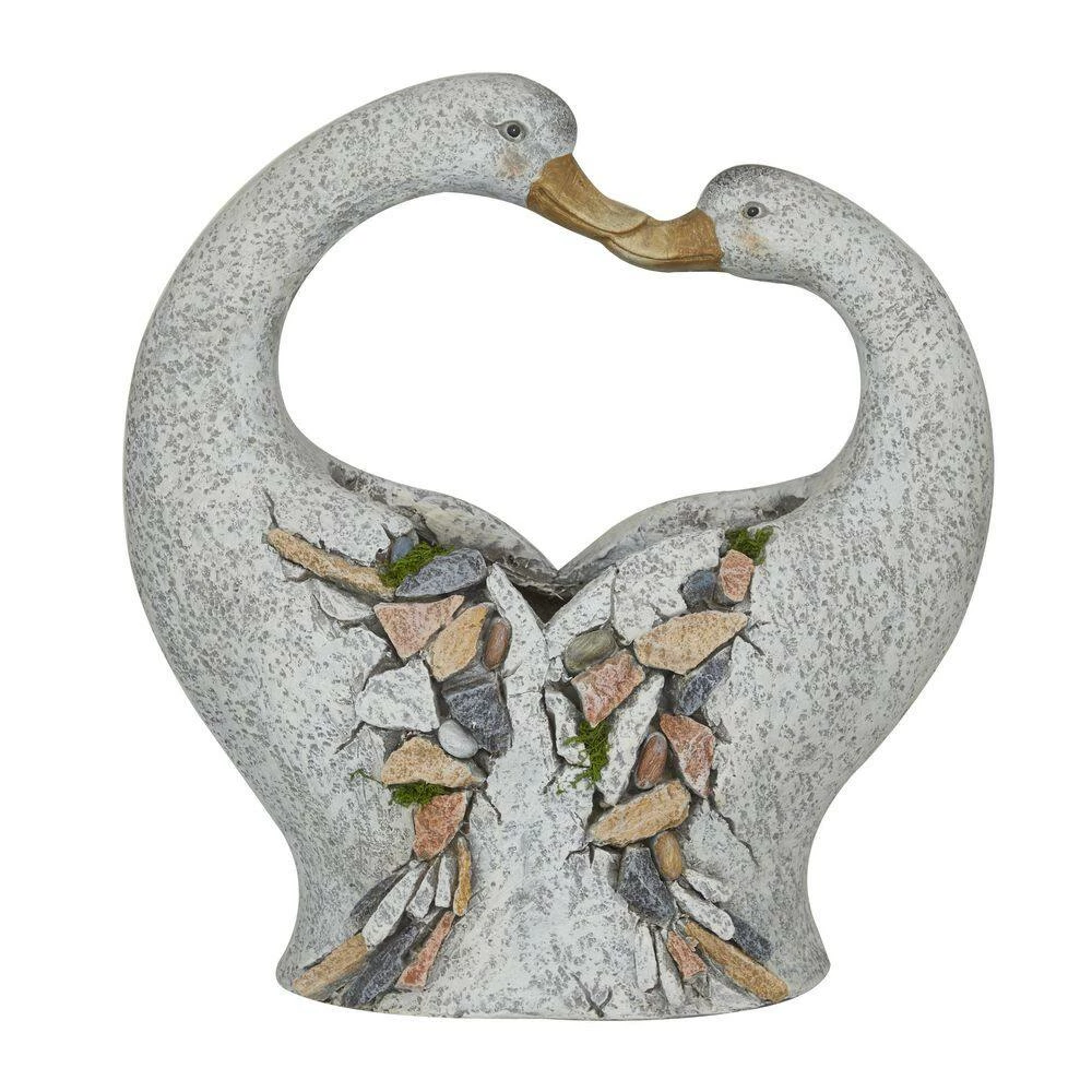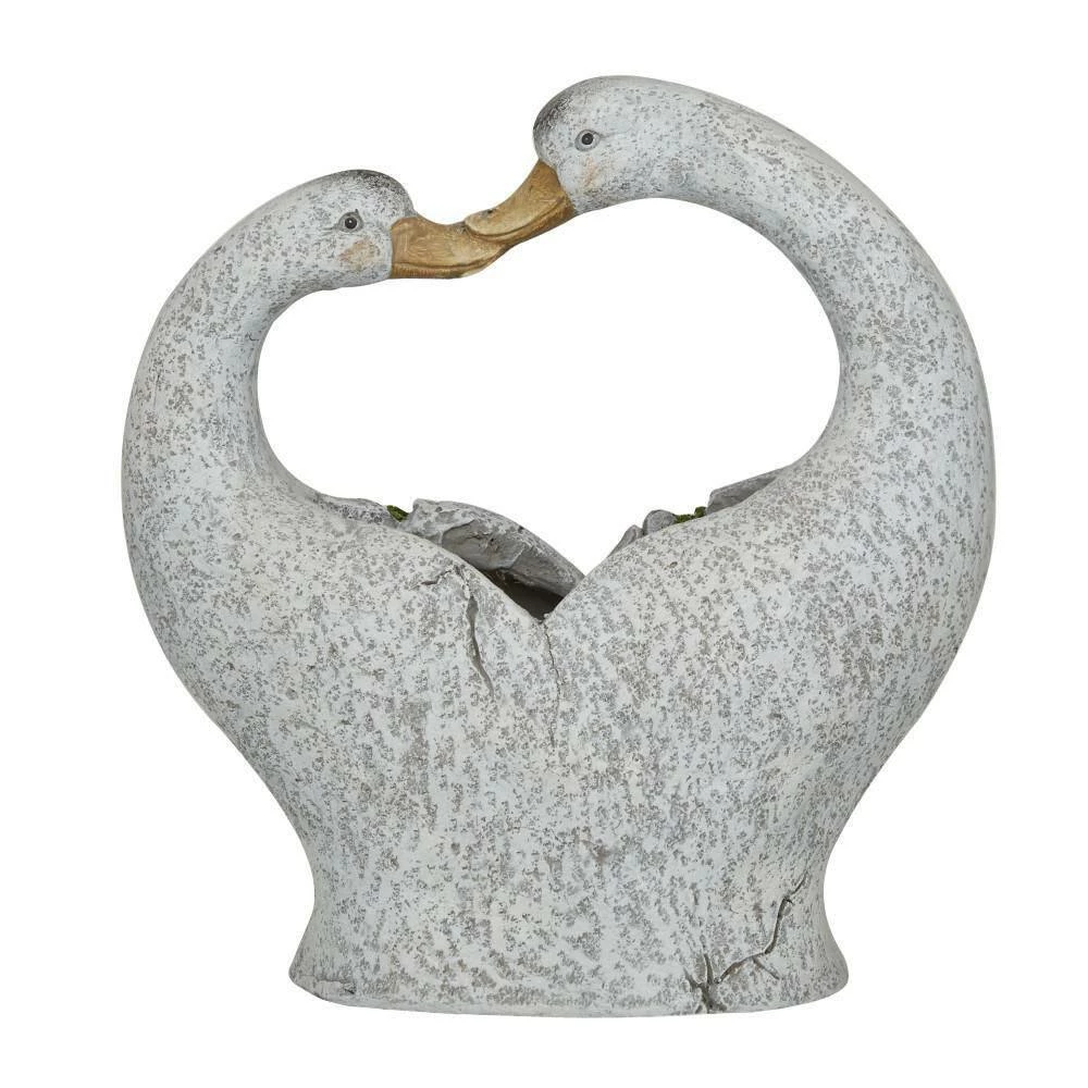 Add a bundle of charm to your garden with this unique kissing geese planter that gives an inviting and whimsical appeal to your outdoor area. Enhance the mood and the look of your room with some plants in these beautifully designed planter. This item features a wide setting with slender structure making a friendly planter for any compact space. Item comes shipped in 1 carton. Suitable for indoor and outdoor use . Easy to clean with a garden hose. An extremely durable, lightweight, frost & UV resistant and almost impervious to the effects of weathering. Traditional Theme. This has no drainage holes.