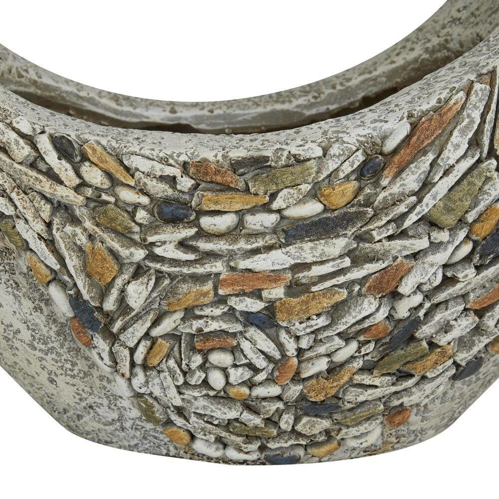 - Fiberglass concrete planter features a tall abstract style heart basket with a swirling stone pattern on its arms and body