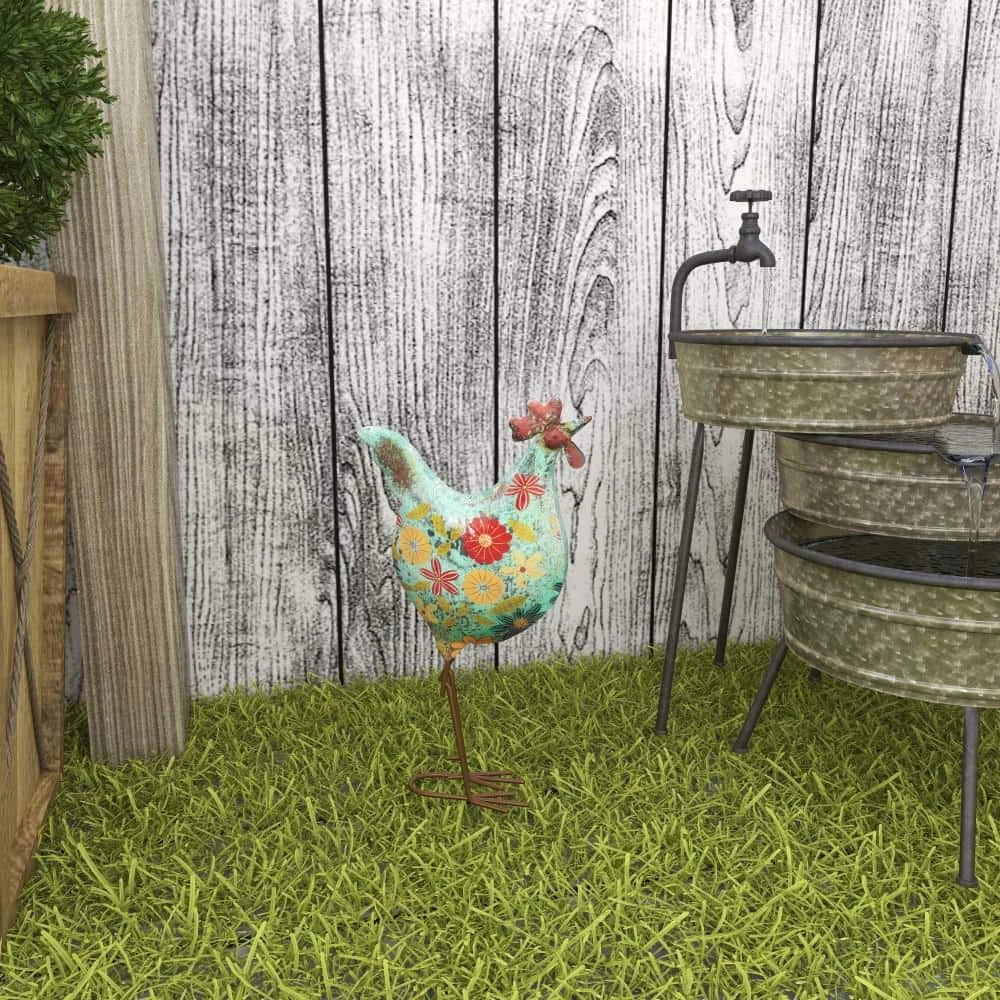 - This garden sculpture is shaped like a rooster with a floral pattern on it