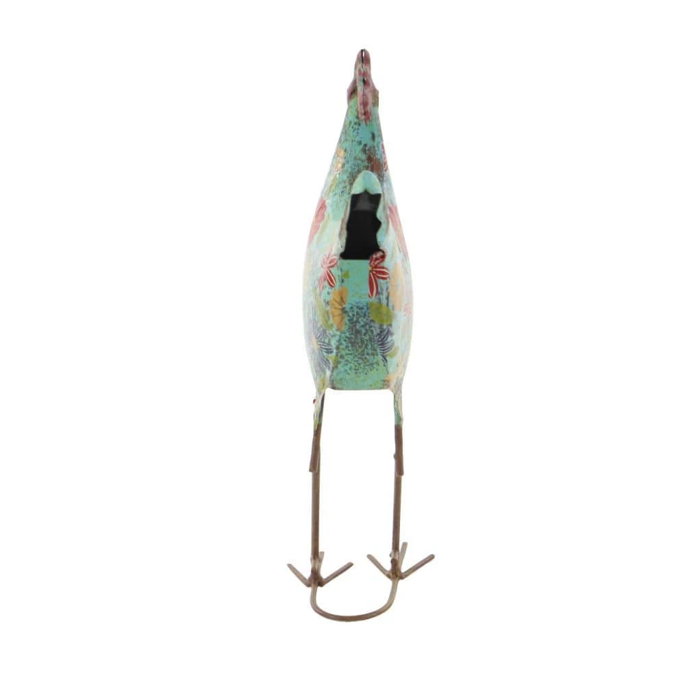 - Features a boho-inspired sculpture of a long-legged rooster with brass-colored legs/feet, a golden beak, and a powder blue body made of a solid iron material