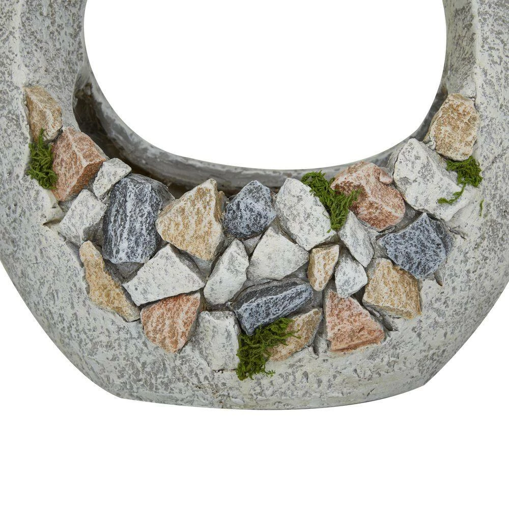 - Distressed gray finish with warm tone hues and green moss highlight this garden planter