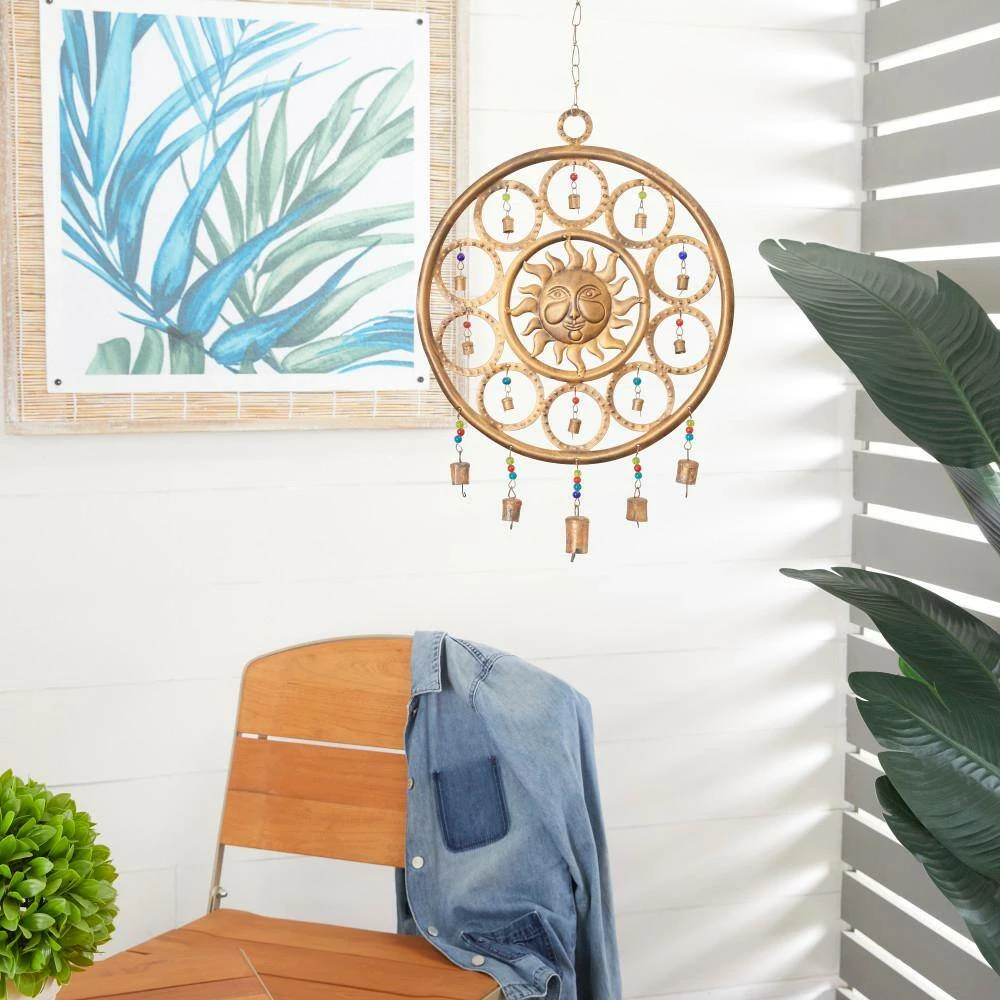 This sun face bell will be a great addition in your eclectic collection when displayed in the living room near the window or door. This item ships in 1 carton. Easy to hang with metal ring; nails and screws are not included. Suitable for indoor use only. Made in India. Eclectic style.