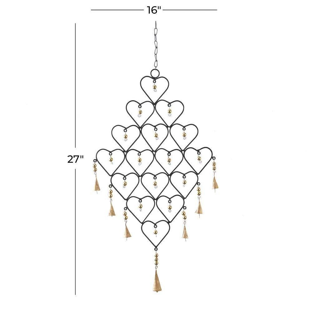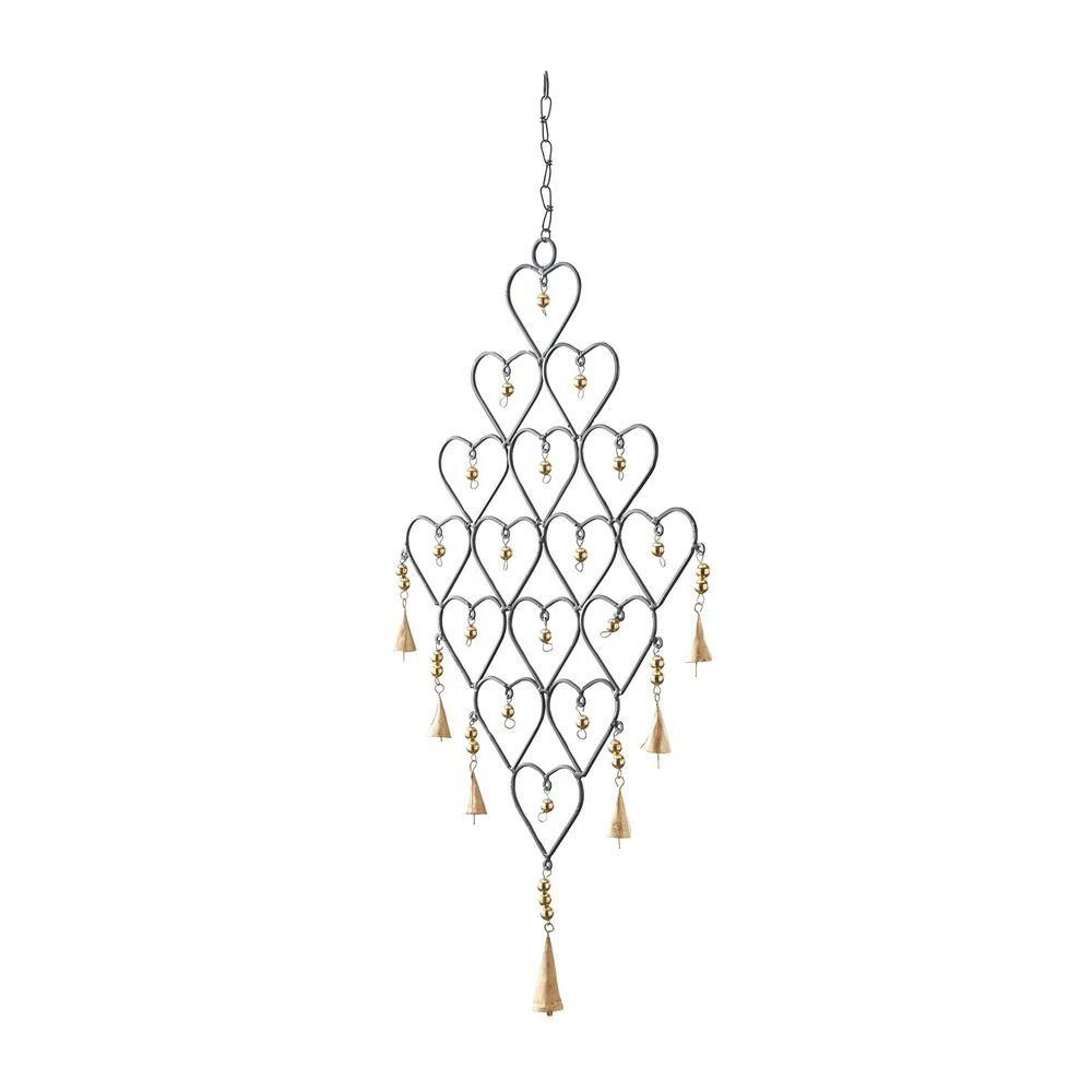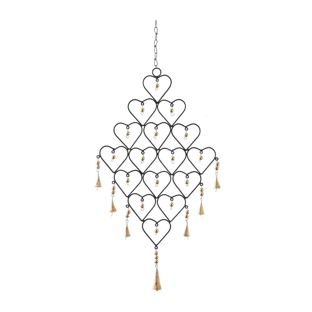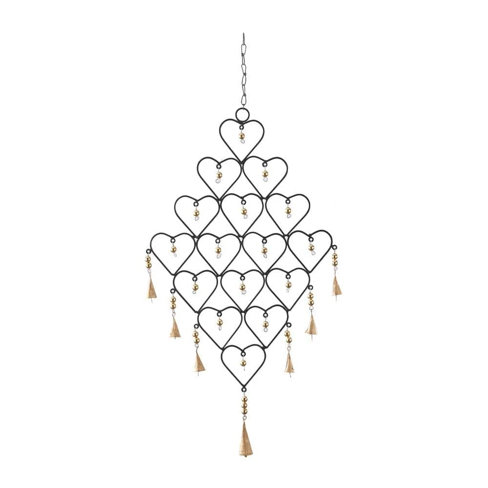 - Collage of heart-shaped metalwork flaunts this hanging windchime with dainty bells and beads accent details