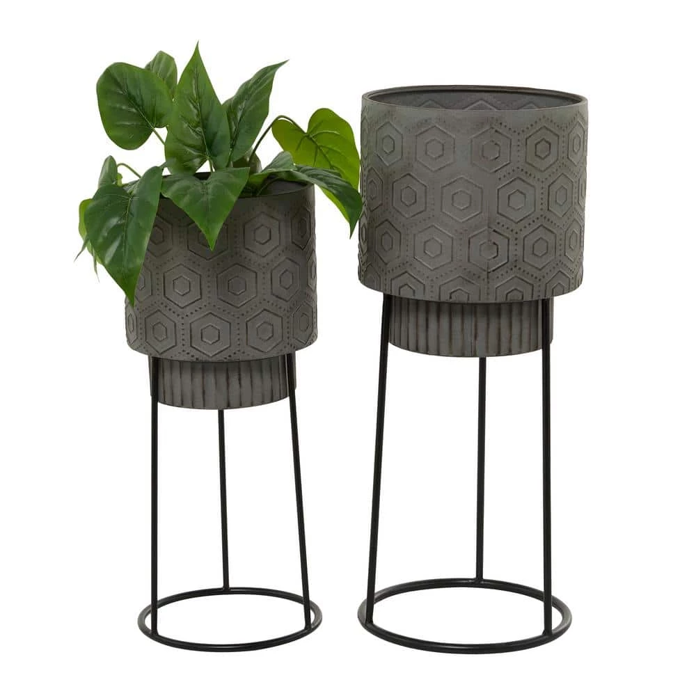 - Planters with detailed metalwork designs are attached to welded leg stands with bases