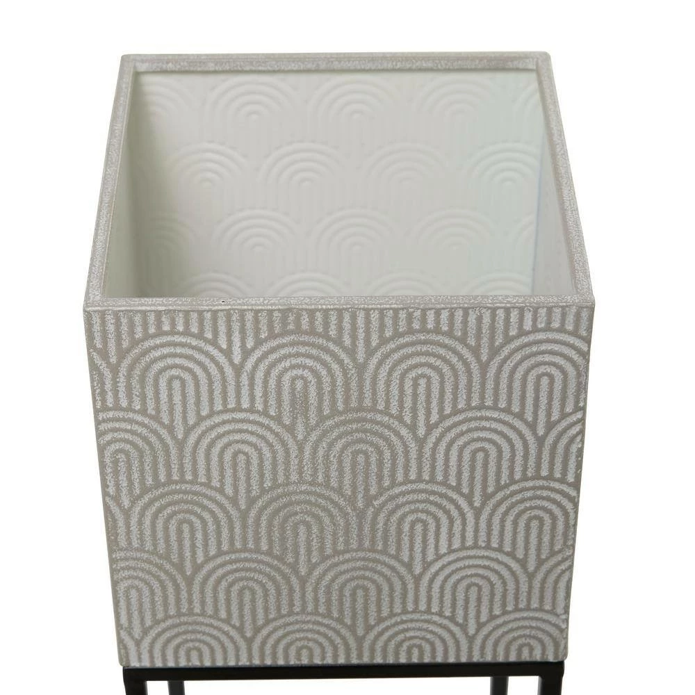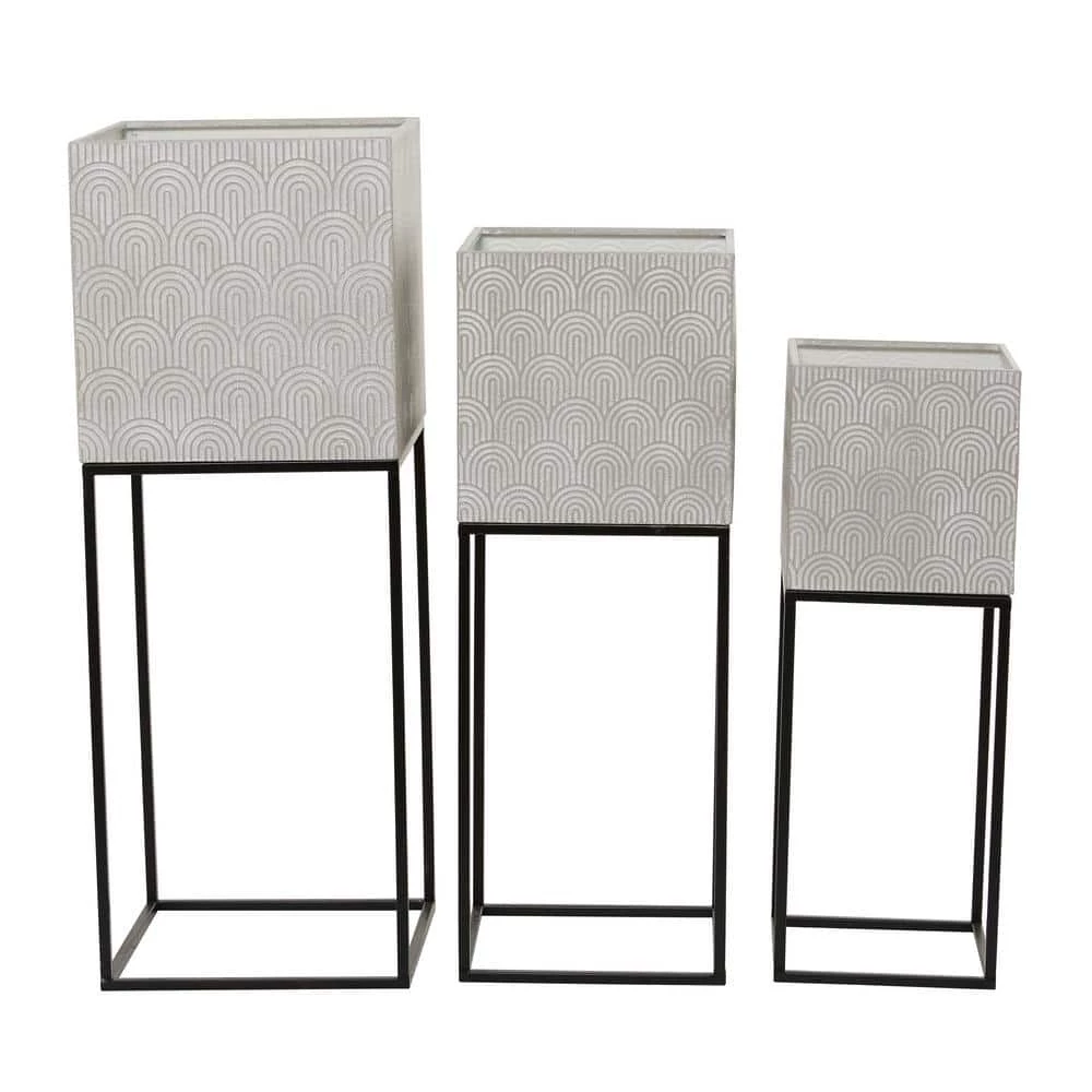 - Planters with detailed metalwork designs are attached to welded leg stands with bases