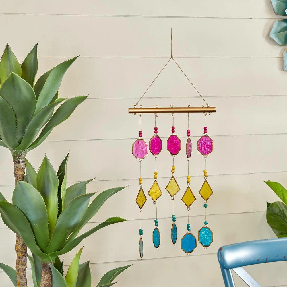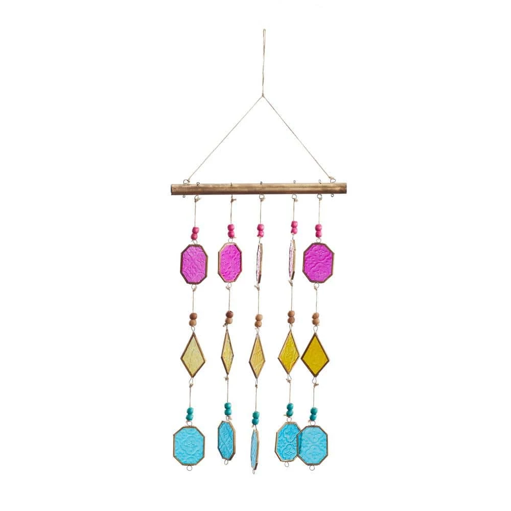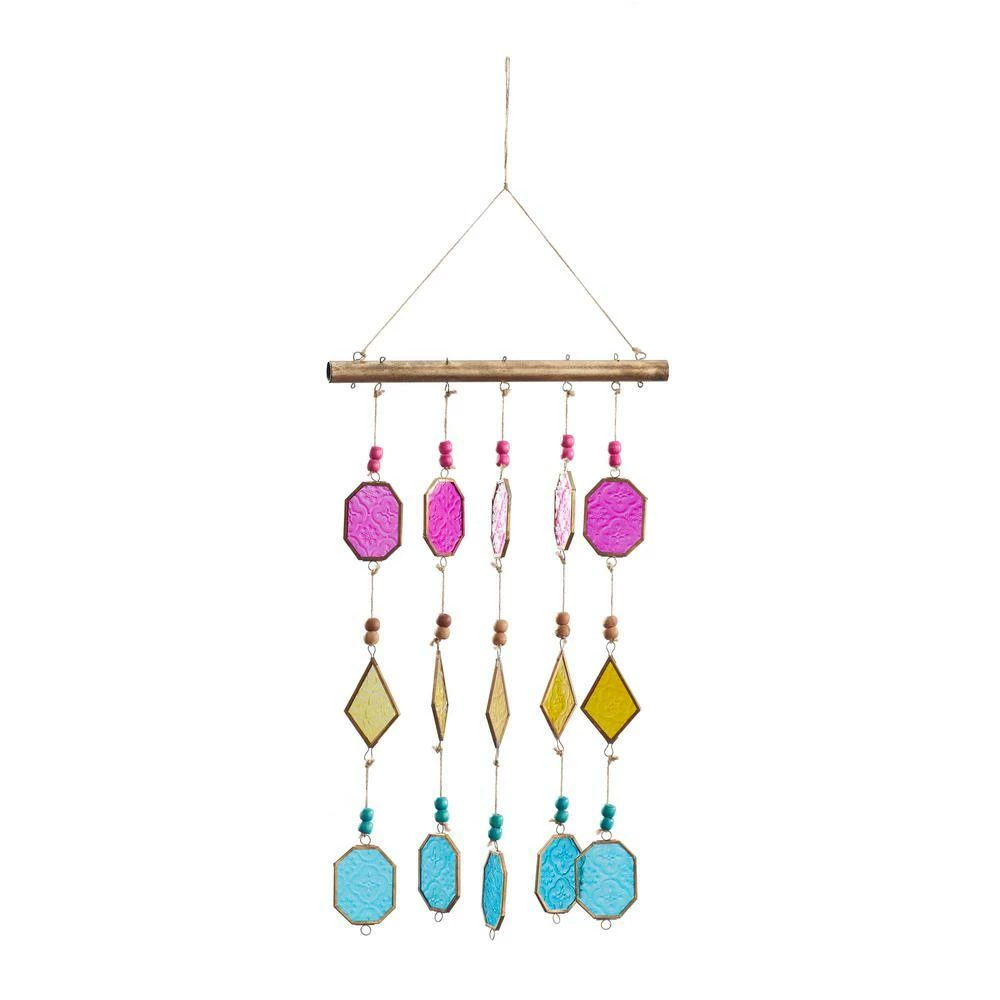 - Soothing windchime features a stylish set of bold colored glass plates in hexagon and diamond shapes attached by a string on a straight metal rod