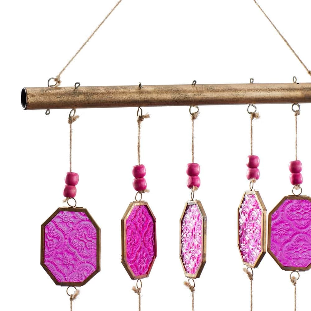 - Colorful string windchime features brass metal bordered glass chimes in purple, yellow and blue finishes