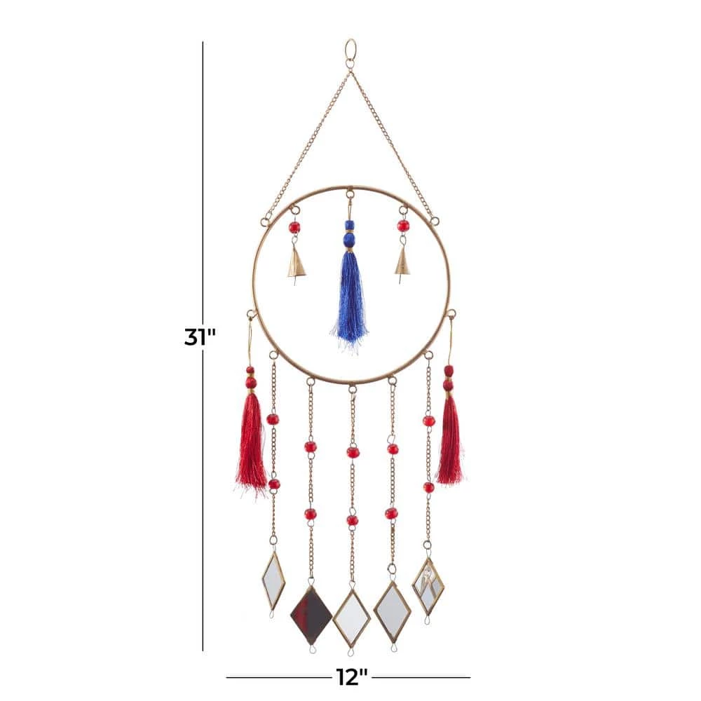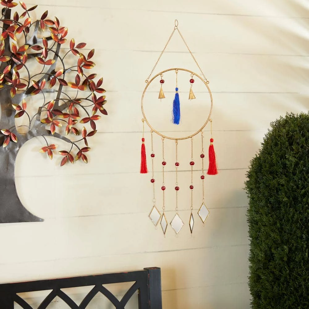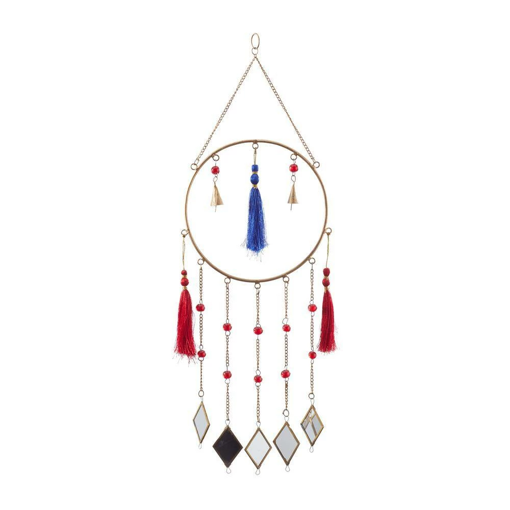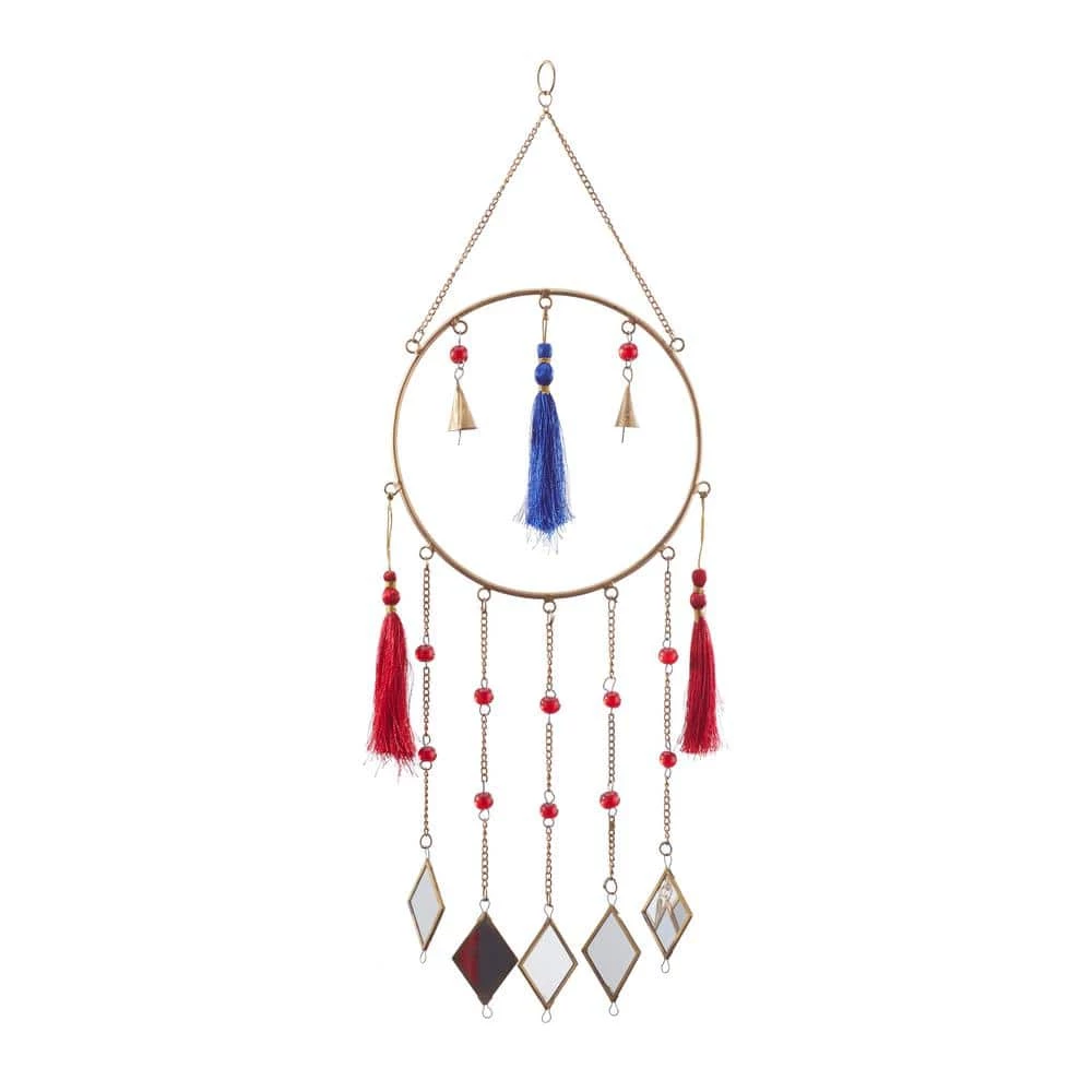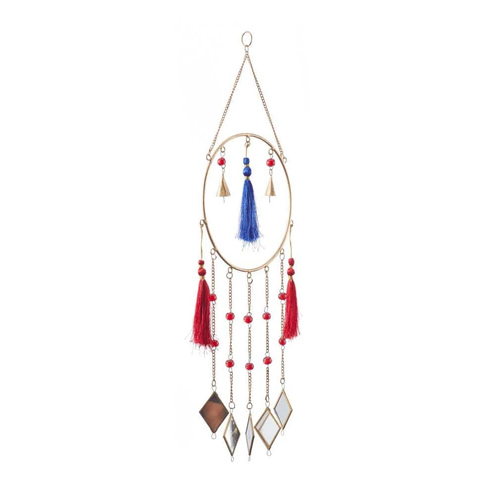 - Delicate chain windchime features brass bordered mirror chimes, gold cone bells and red and blue string tails