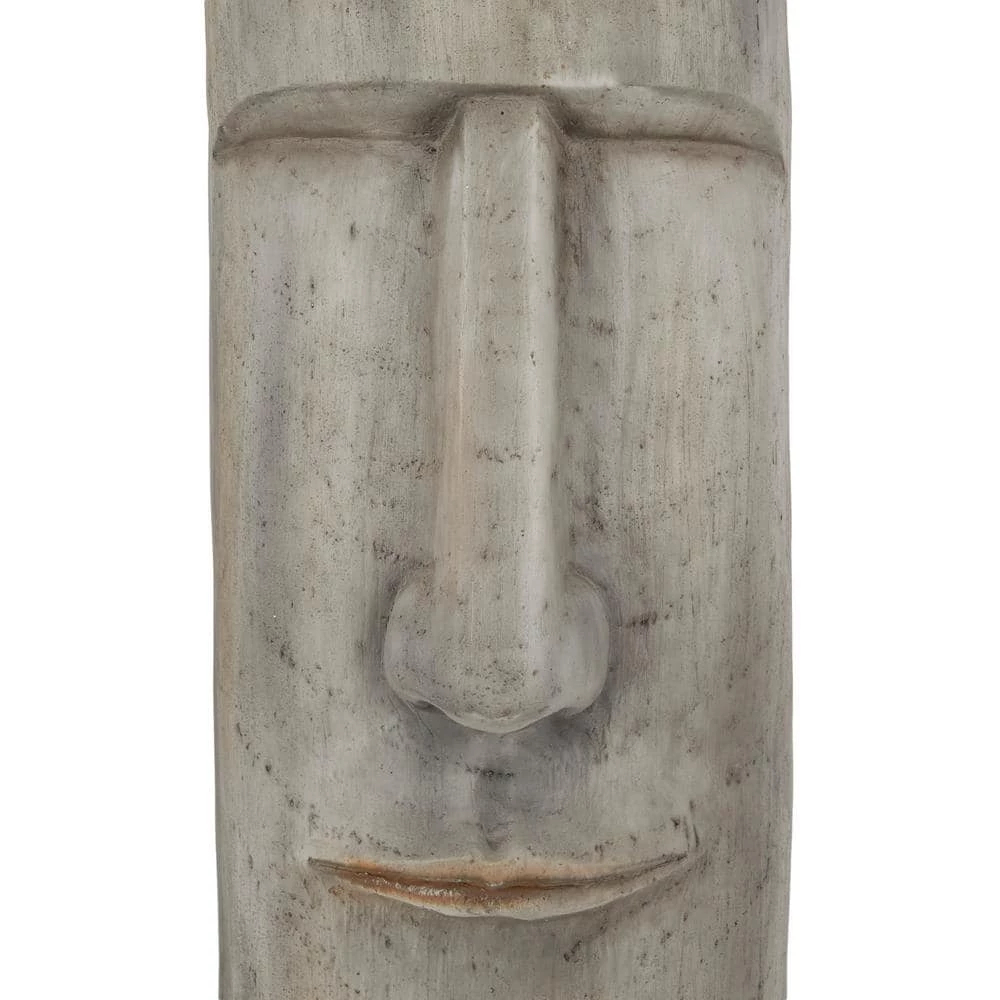 - A carved out elongated slender face with deep-set eyes and thin lips feature this garden sculpture