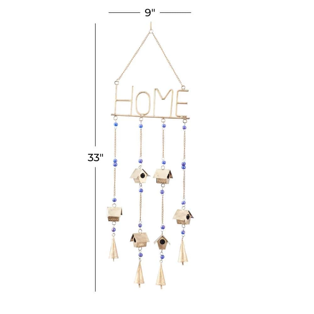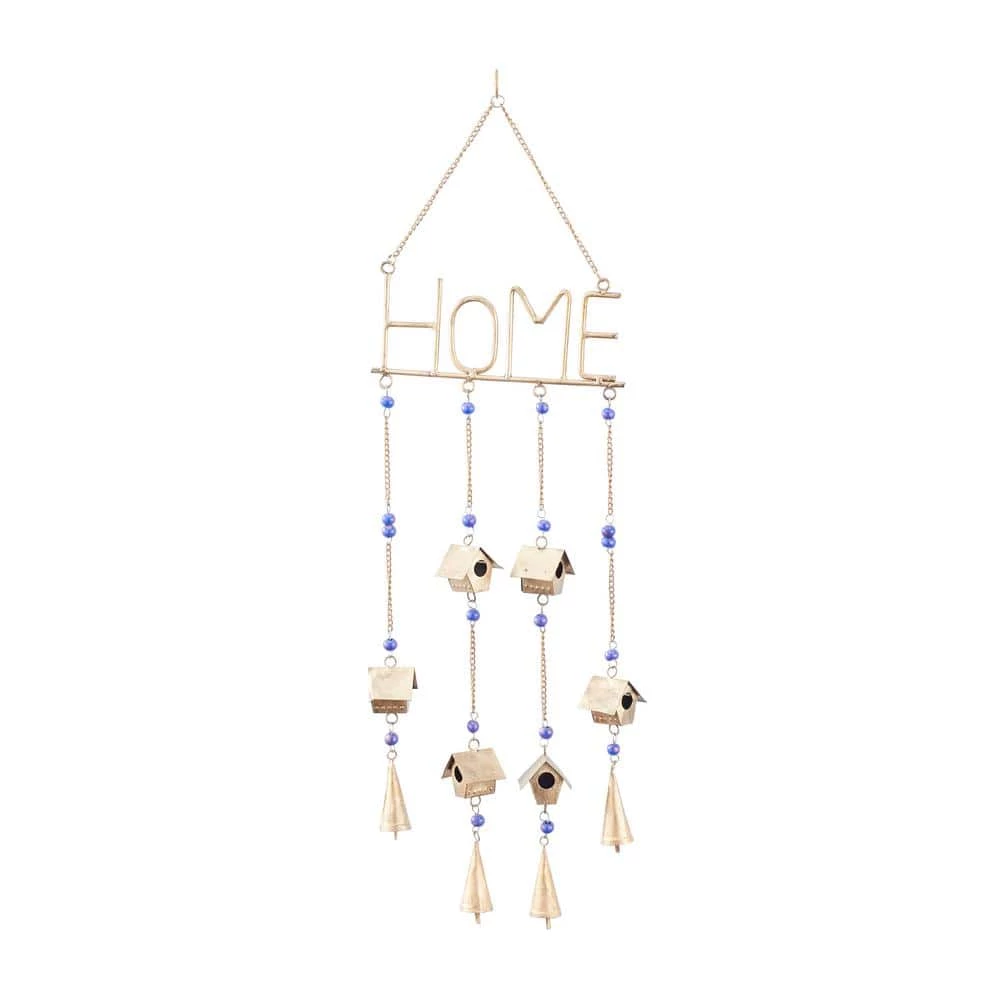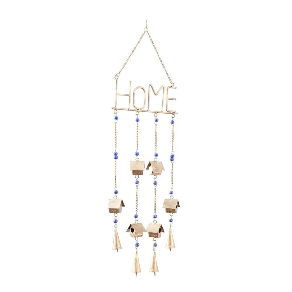 - New home windchime features a metallic gold iron finish and a blue glass bead finishes
