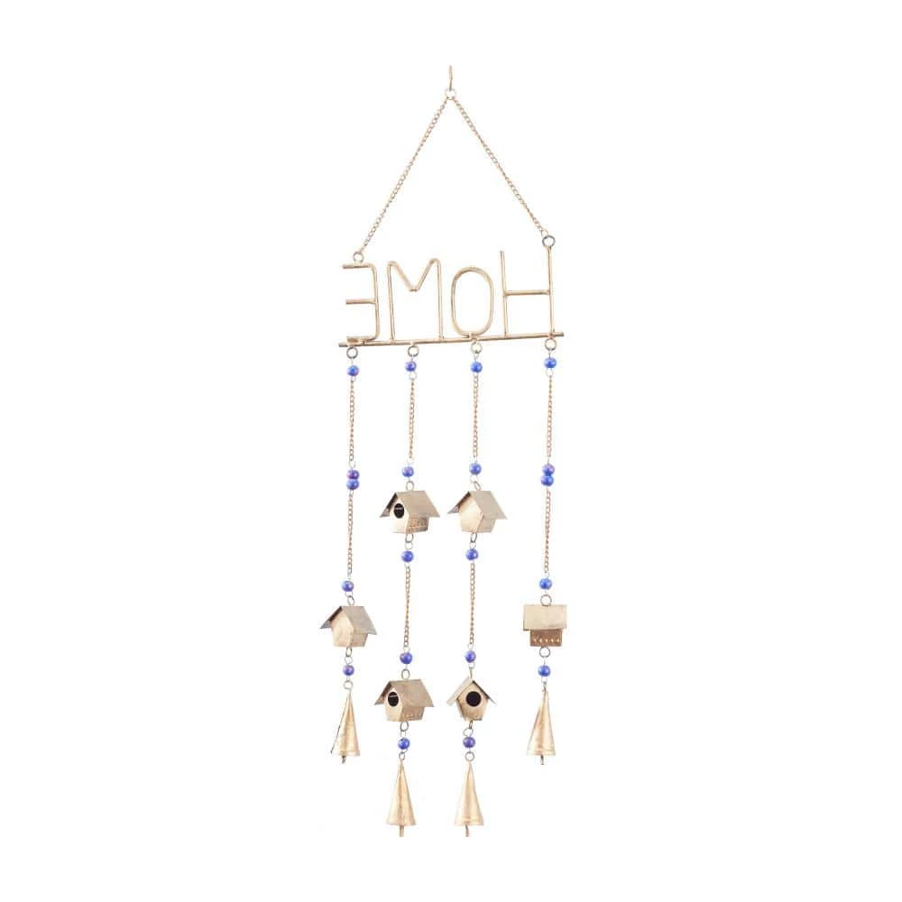 Let the wind give music to your ears as you hang this sweet home windchime on your front doors, top windows and balcony area. A light and delicate piece to create a whimsical atmosphere anywhere in your home. The soothing sound of this windchime will keep you relax and rejuvenated throughout the day. This item is shipped in 1 carton. Iron is sculpted and chains are decorated to form a charming HOME windchime design. This windchime features a durable chain hanger for easy hanging via nail or hook, suitable for indoor and outdoor use. Made in India. Traditional style. This windchime features a HOME base sign.