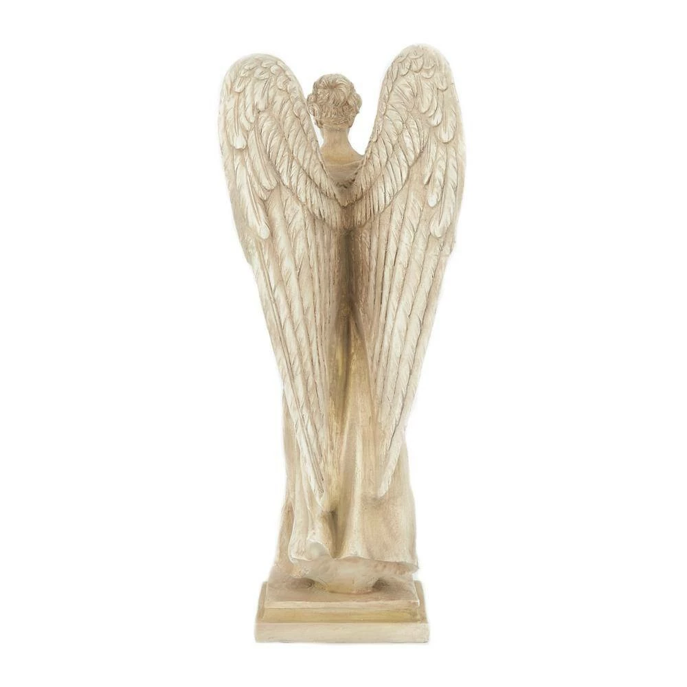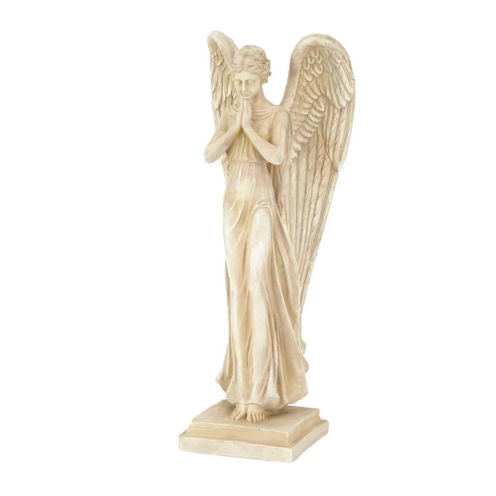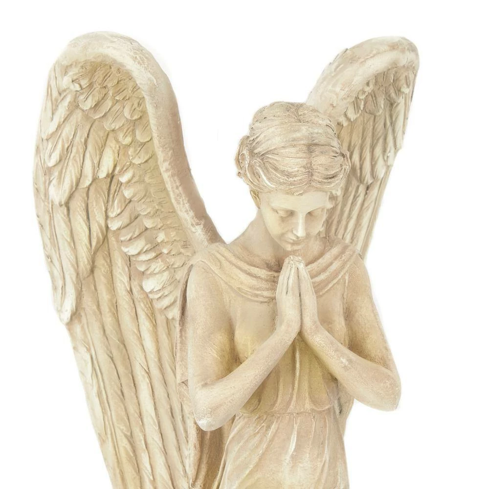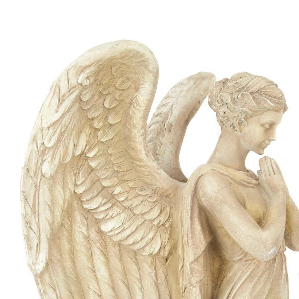 - Ornate details of an angel flaunts this sculpture with hands in prayer and folded wings that complement its delicate clothing