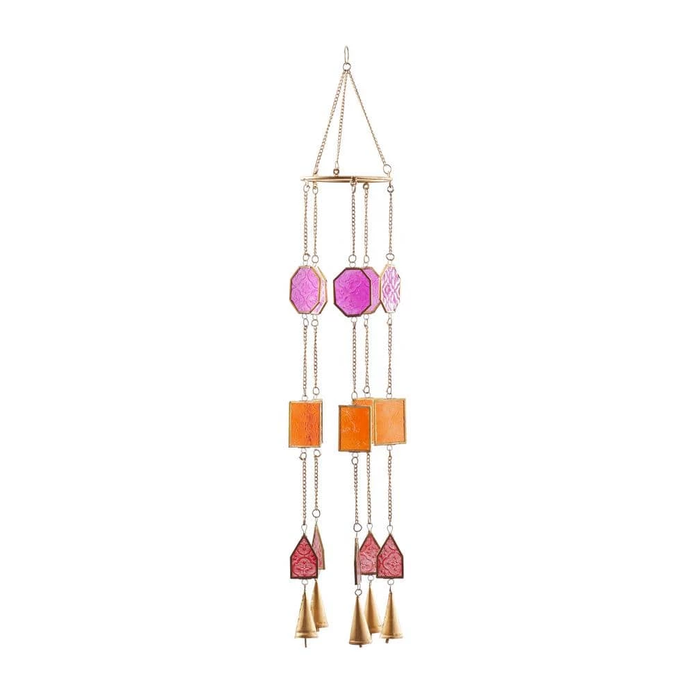 - Artistic glass windchime features 5 chained lines of geometric shaped glass plates in a tricolor pattern and cone shaped bells at the bottom