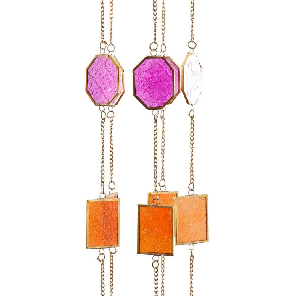 - Colorful chain windchime features metallic gold bell cones and brass metal bordered glass chimes in purple, orange and red finishes