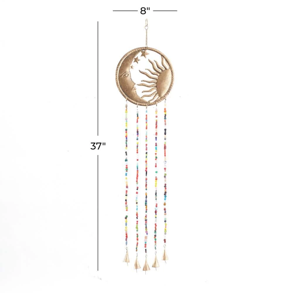 Let the wind give music to your ears as you hang this delightful windchime on the top of your doors, windows and balcony area. A light and delicate piece to create a whimsical atmosphere anywhere in your home. The soothing sound of this windchime will keep you relax and rejuvenated throughout the day. This item is shipped in 1 carton. Iron is sculpted and glass beads are sewn into a string to form a sun, moon and stars windchime. This windchime features a durable chain hanger for easy hanging via nail or hook, suitable for indoor and outdoor use. Made in India. Glam style.