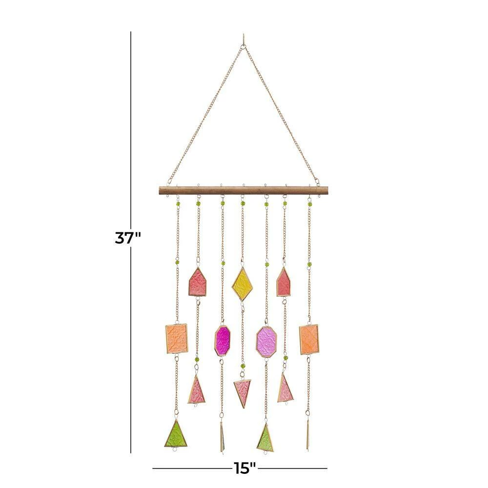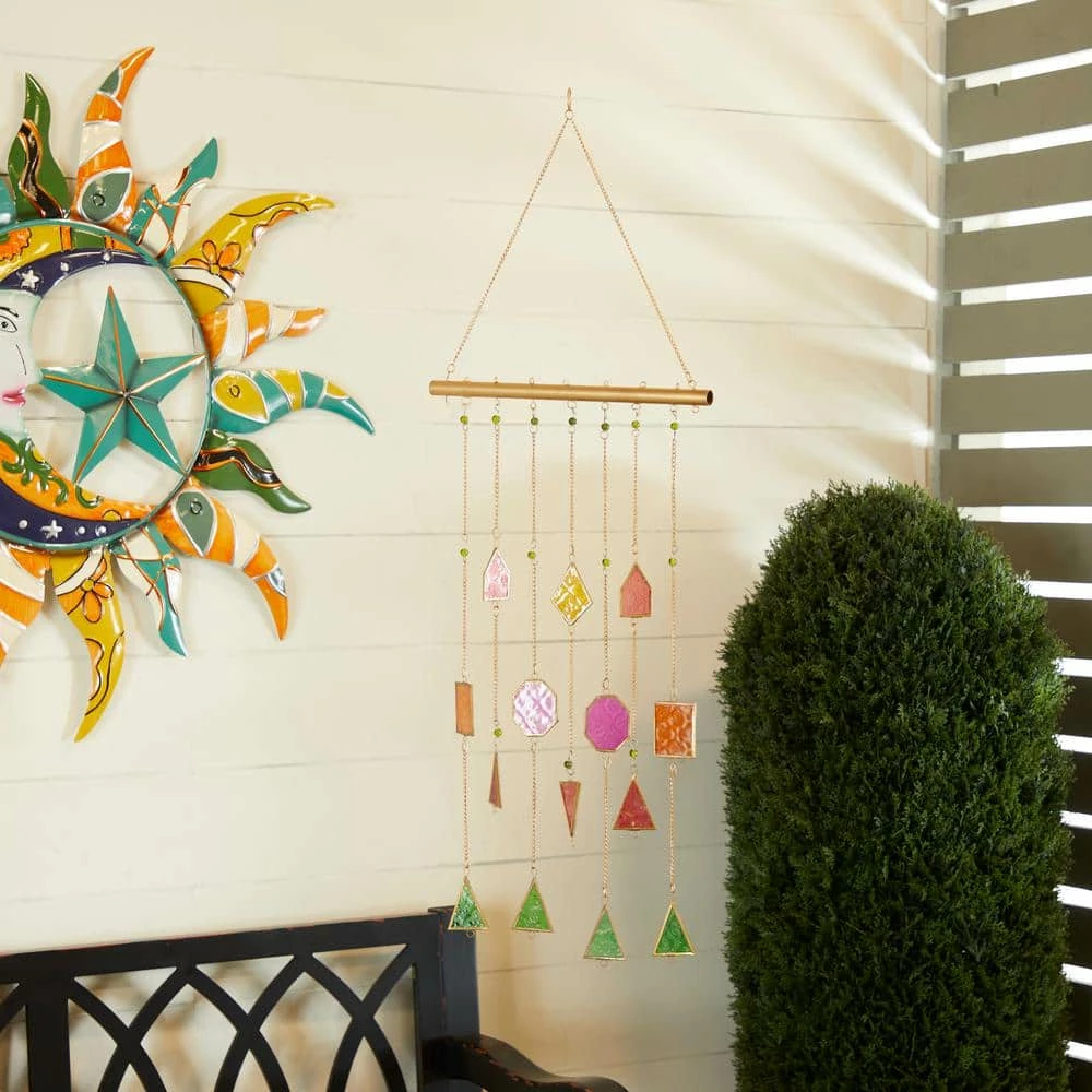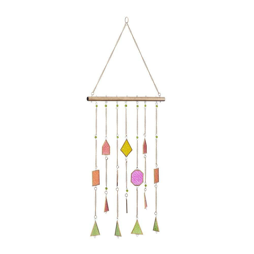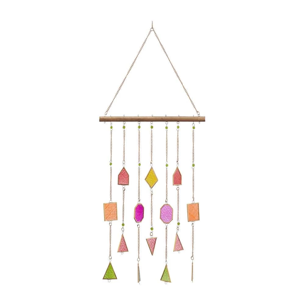 - Soothing windchime features a stylish set of multi-colored glass plates in various geometric shapes attached by a chain on a straight metal rod