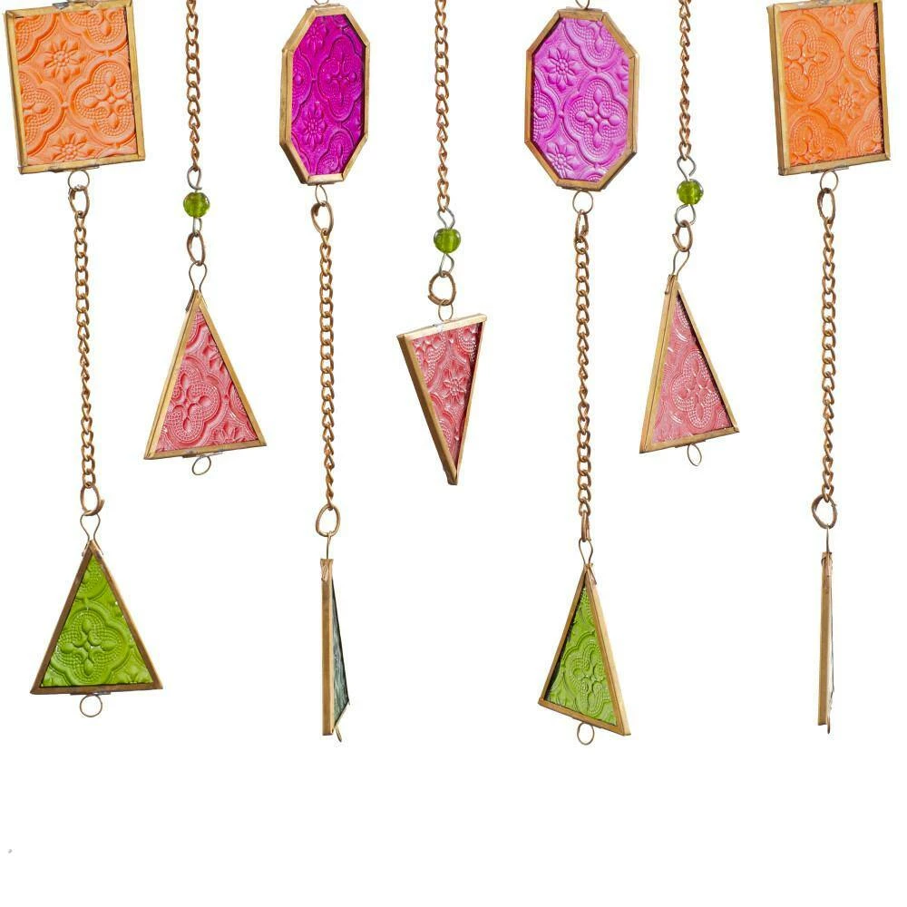 Let the wind give music to your ears as you hang this serene windchime on the top of your doors, windows and balcony area. A light and delicate piece to create a whimsical atmosphere anywhere in your home. The soothing sound of this windchime will keep you relax and rejuvenated throughout the day. This item is shipped in 1 carton. Glass is cut into various shapes to form a delightful collection of glass plated windchimes. This windchime features a durable chain hanger for easy hanging via nail or hook, suitable for indoor and outdoor use. Made in India. Contemporary style.