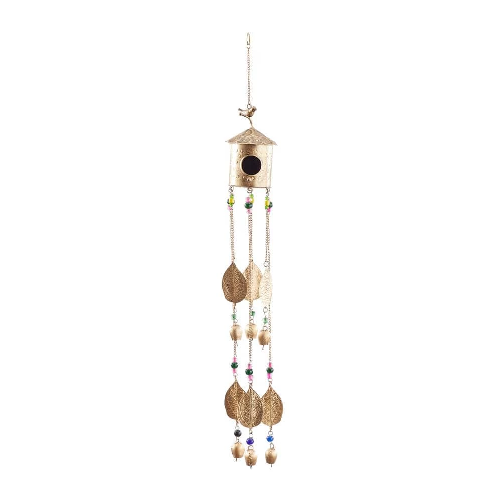 - Elegant garden windchime features a birdhouse top design and decorative chains with glass beads, bells and metal carved leaf chimes