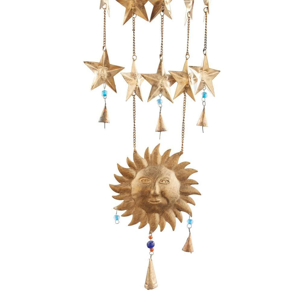 - This whimsical windchime brings a celestial atmosphere into any space with its moon, stars and sun figures attached to a chain ring for convenient hang