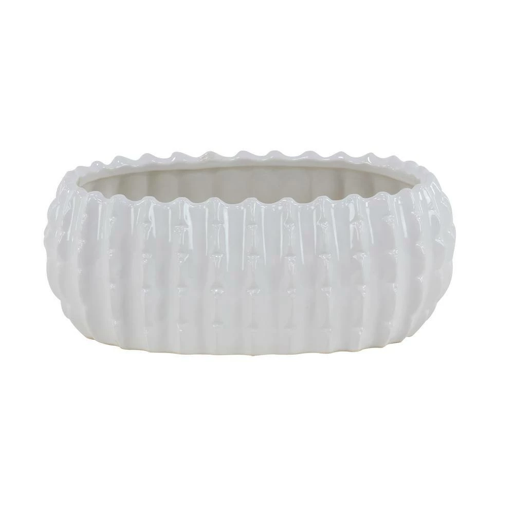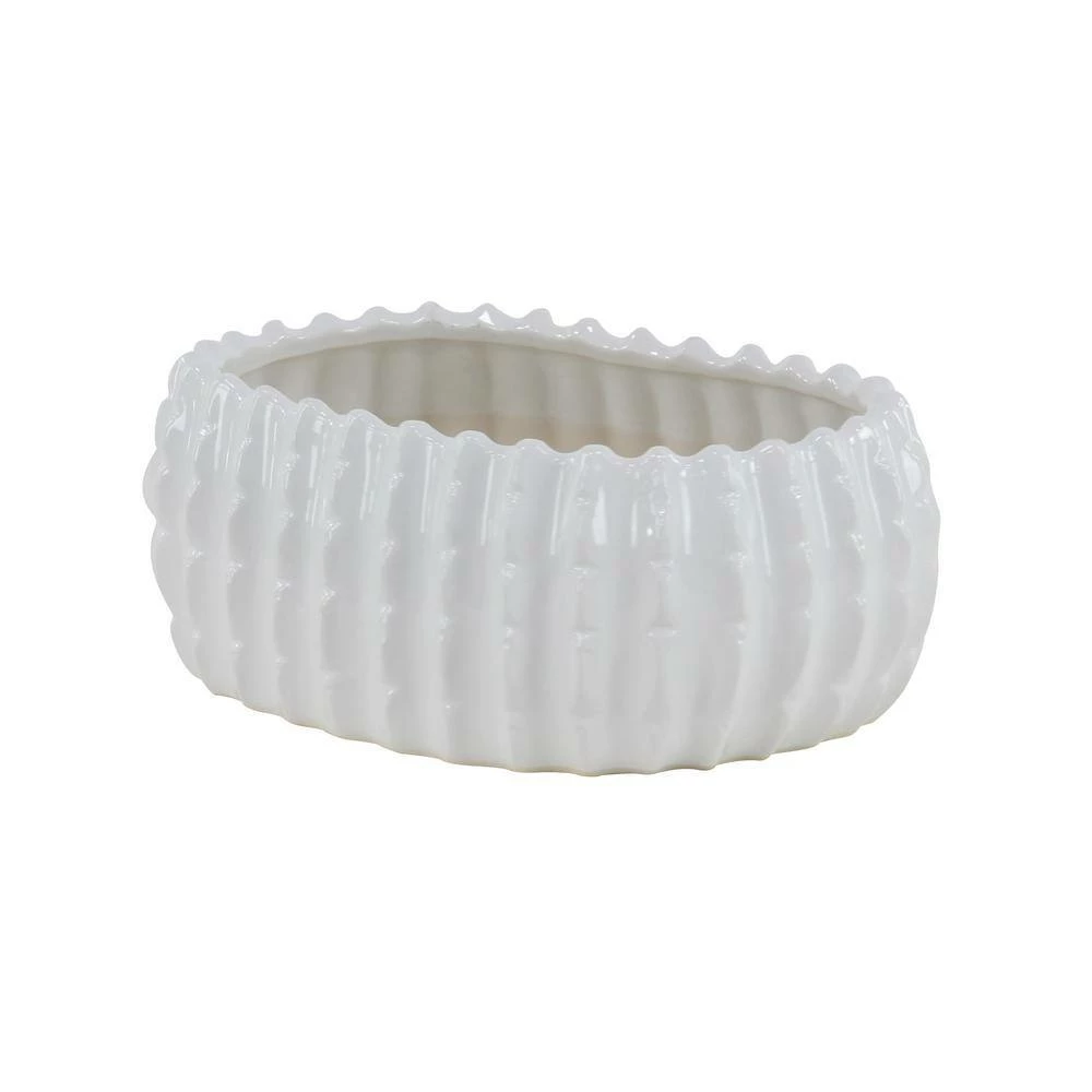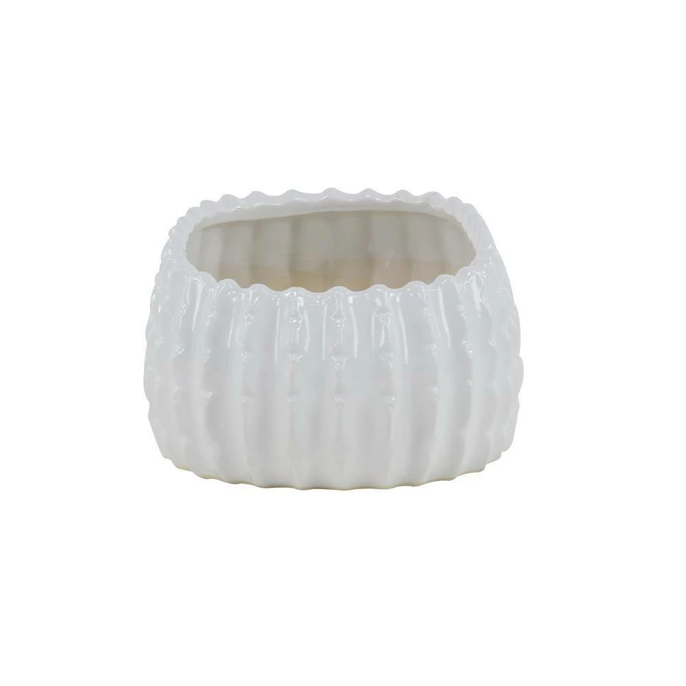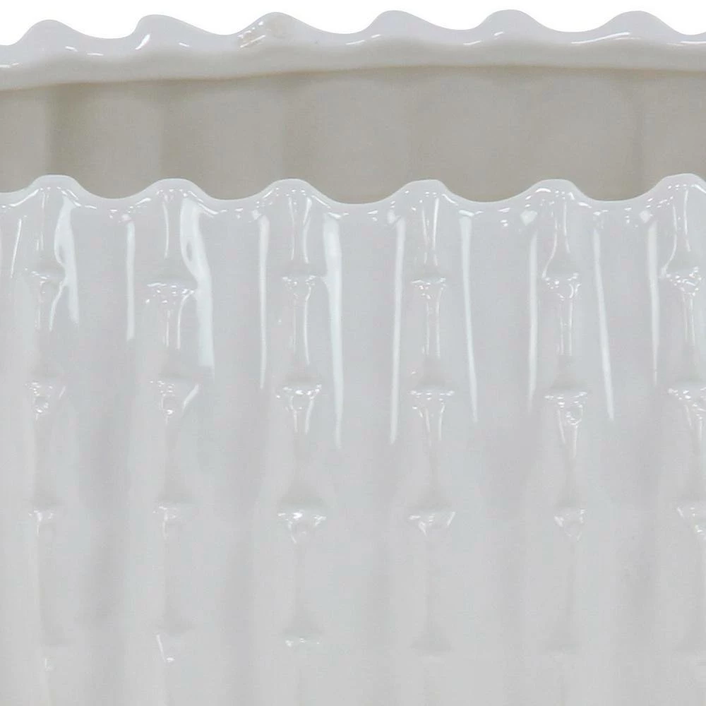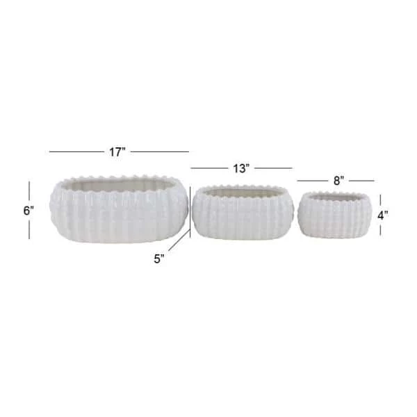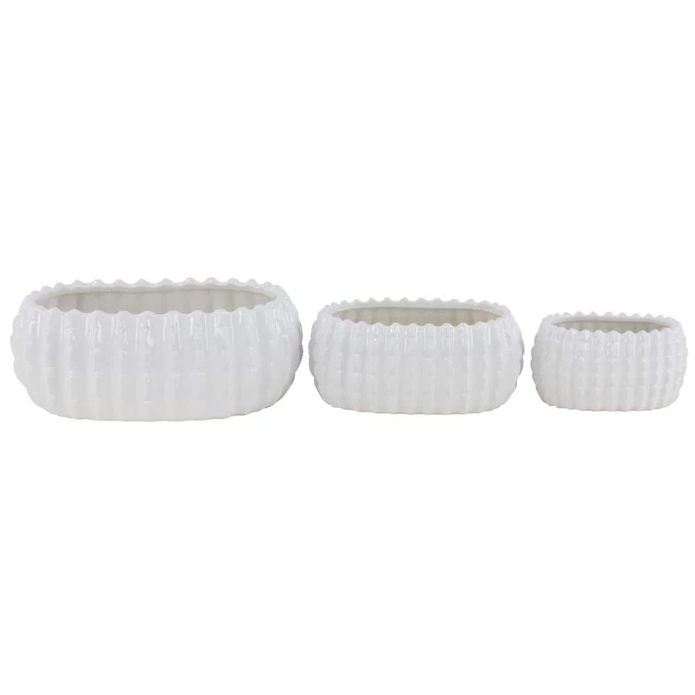 This set of round white planters brings tranquility to your space by allowing you to fill them with plants-hence it promotes wellness and creates an immediate feeling of relaxation. These decorative planters are sure to add bundles of charm to your home. Beautifully detailed, they feature rounded pots in glossy white finish with unique vertical ribbing. These planters are made out of ceramic with solid construction, offering durability. Jazz up traditional themed spaces using this set of charming accent pieces that are ideal for indoor and outdoor use. A neutral yet textured white finishes complements any pattern or color palette with a posh touch Wipe clean with a dry cloth. These modern planters are designed with unique vertical ribbing. Suitable for indoor and outdoor use No drainage holes. This is a 3-in-1 set of indoor table planters. Traditional style. This item comes shipped in one carton.