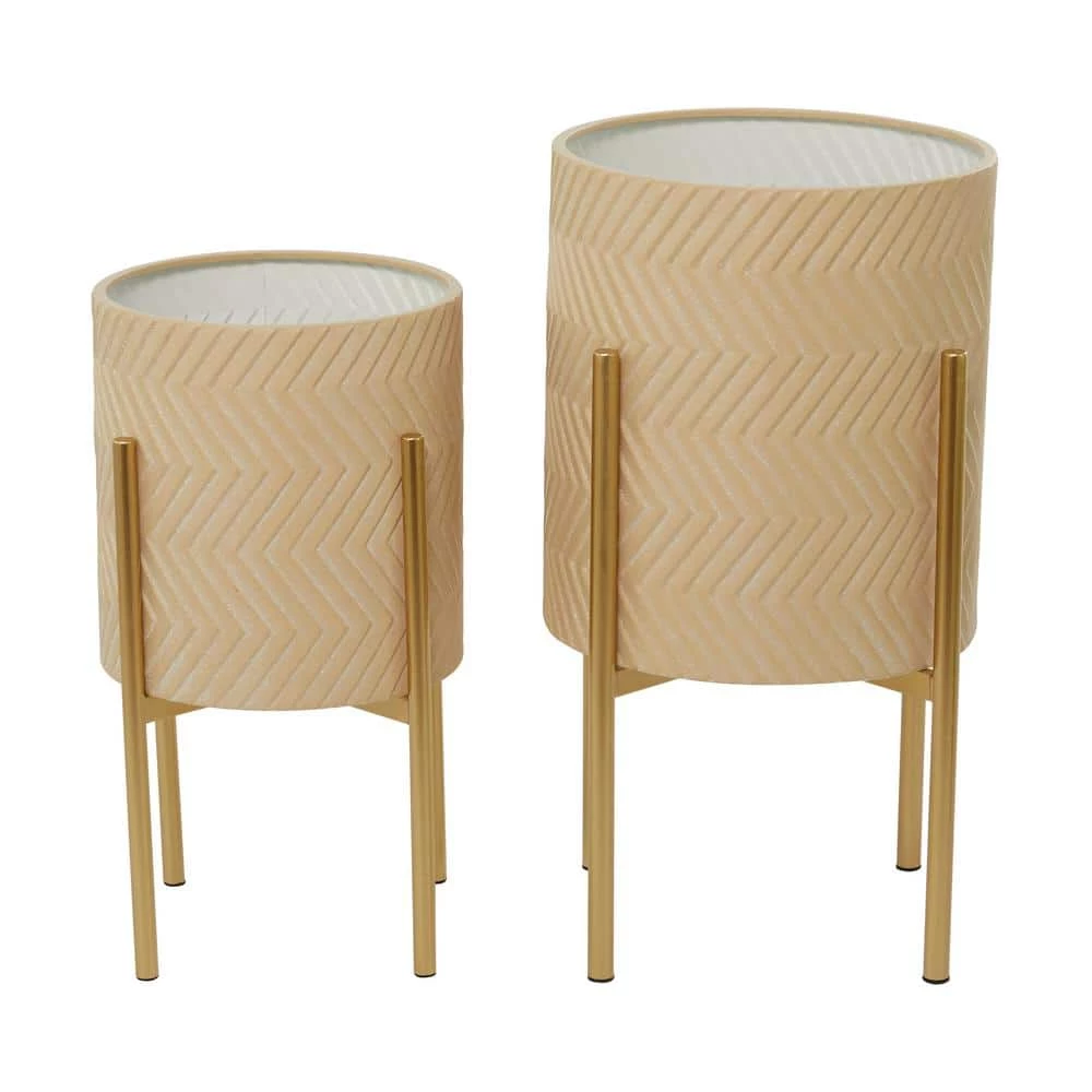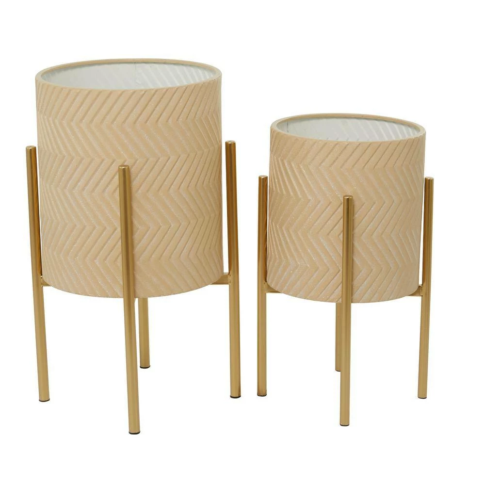 - Bohemian-inspired planters that feature beige metal cylindrical pots with a zigzag pattern mounted on gold open metal stands with x-shaped supports and rubber stoppers