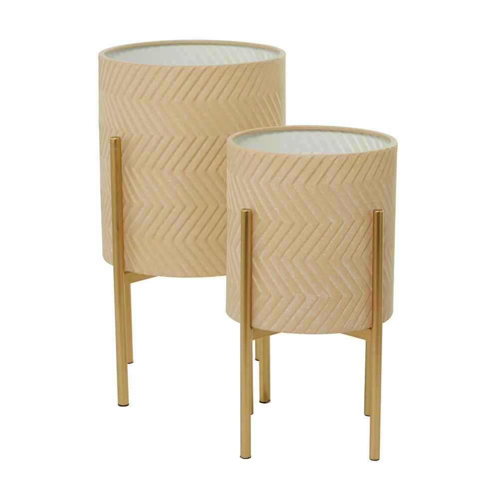 - A set of 2 beige cream metal planters that comes with cylindrical pots designed with a zigzag pattern