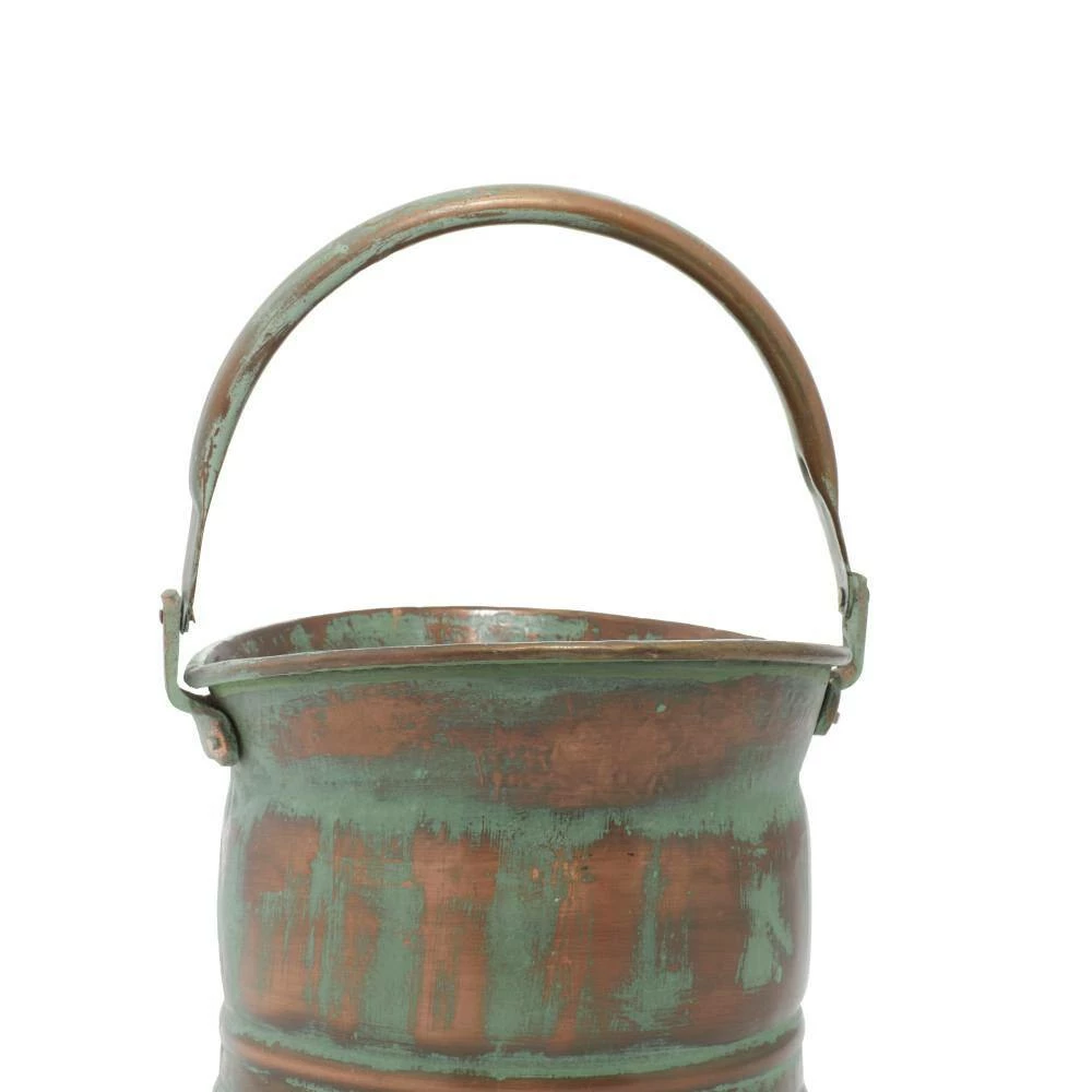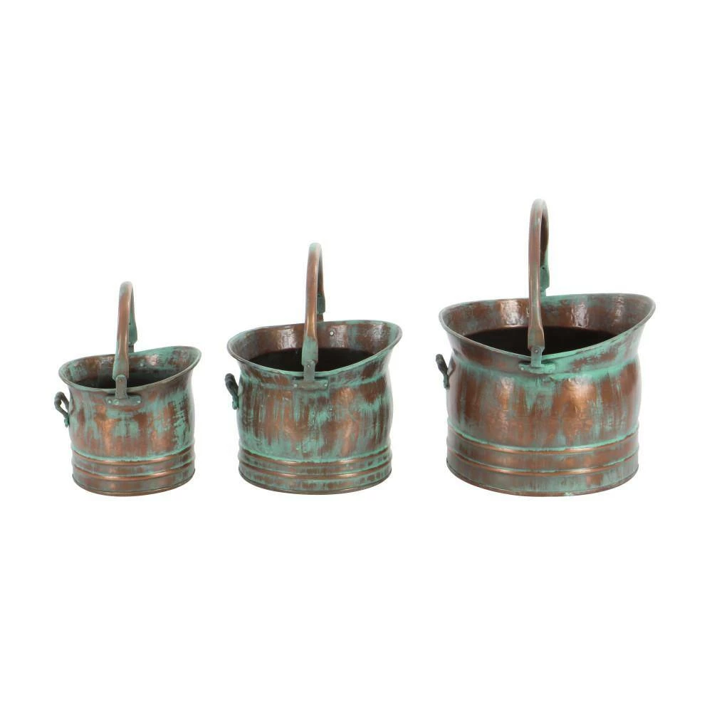 These stylish copper plant holders are great additions to gardens, patios, and living spaces with a rustic or farmhouse theme. This item ships in 1 carton. Suitable for indoor and outdoor use. Made in India. Planters do not have drainage holes but they are not watertight. A set of three metal planters with handles. Rustic style.