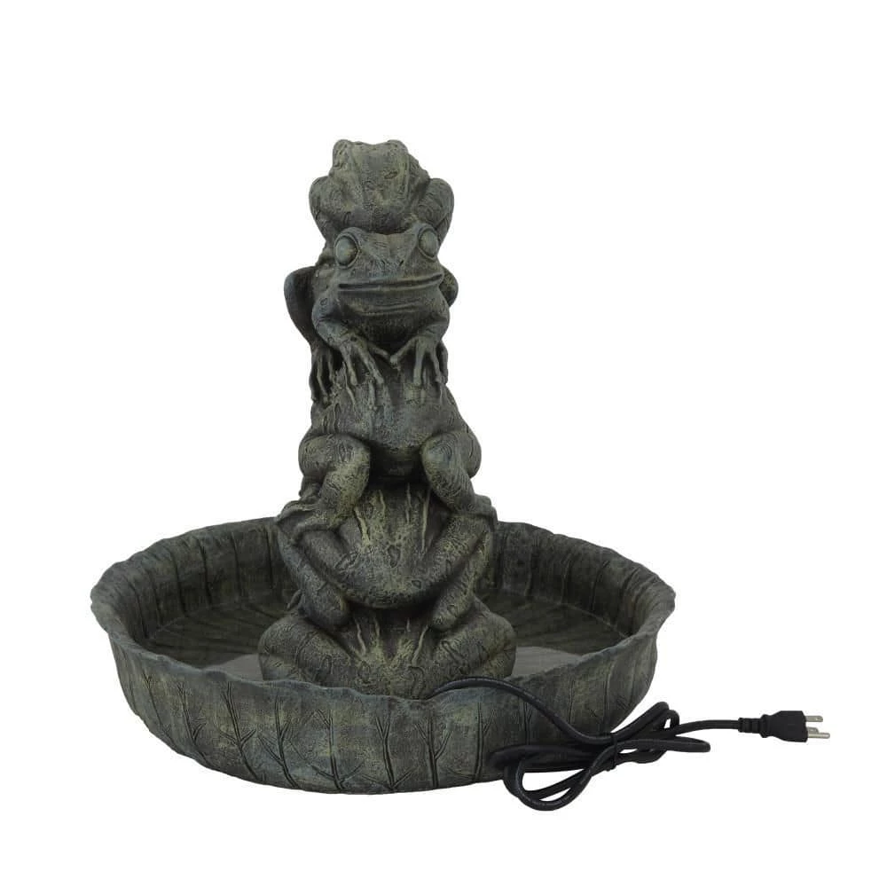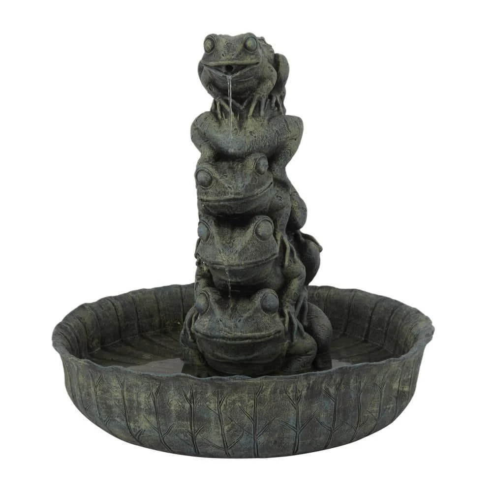 - Water fountain accentuates a stack of frogs on a lotus leaf
