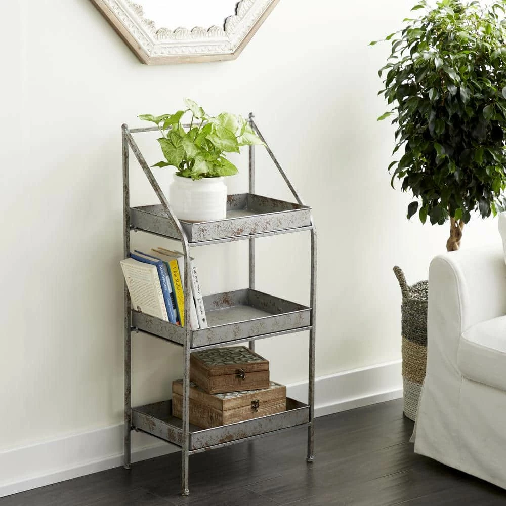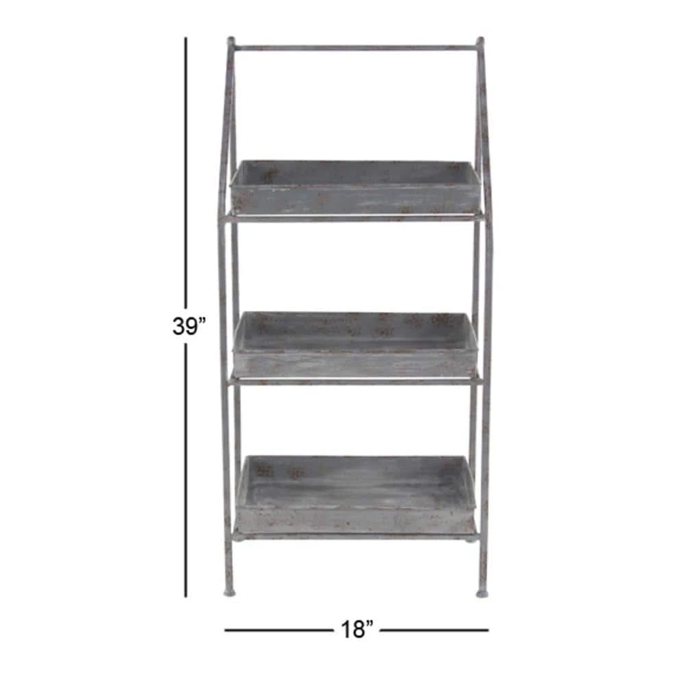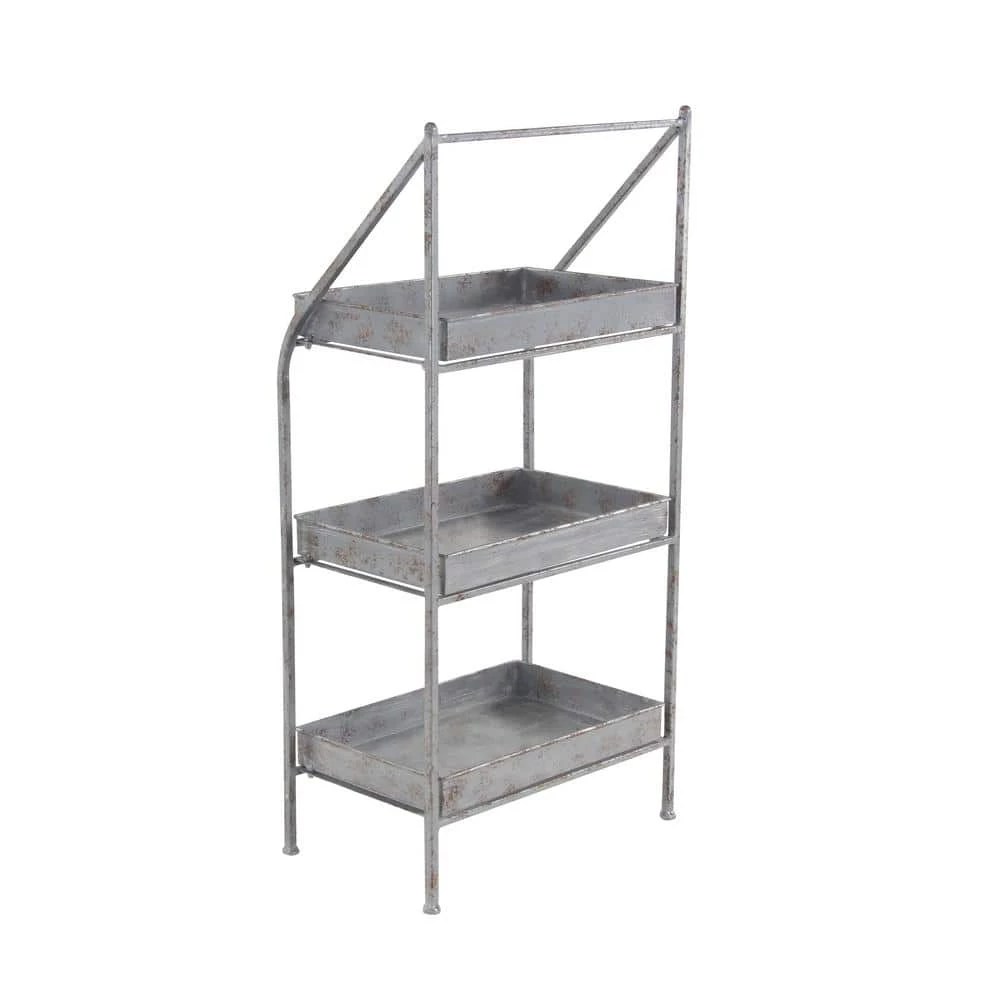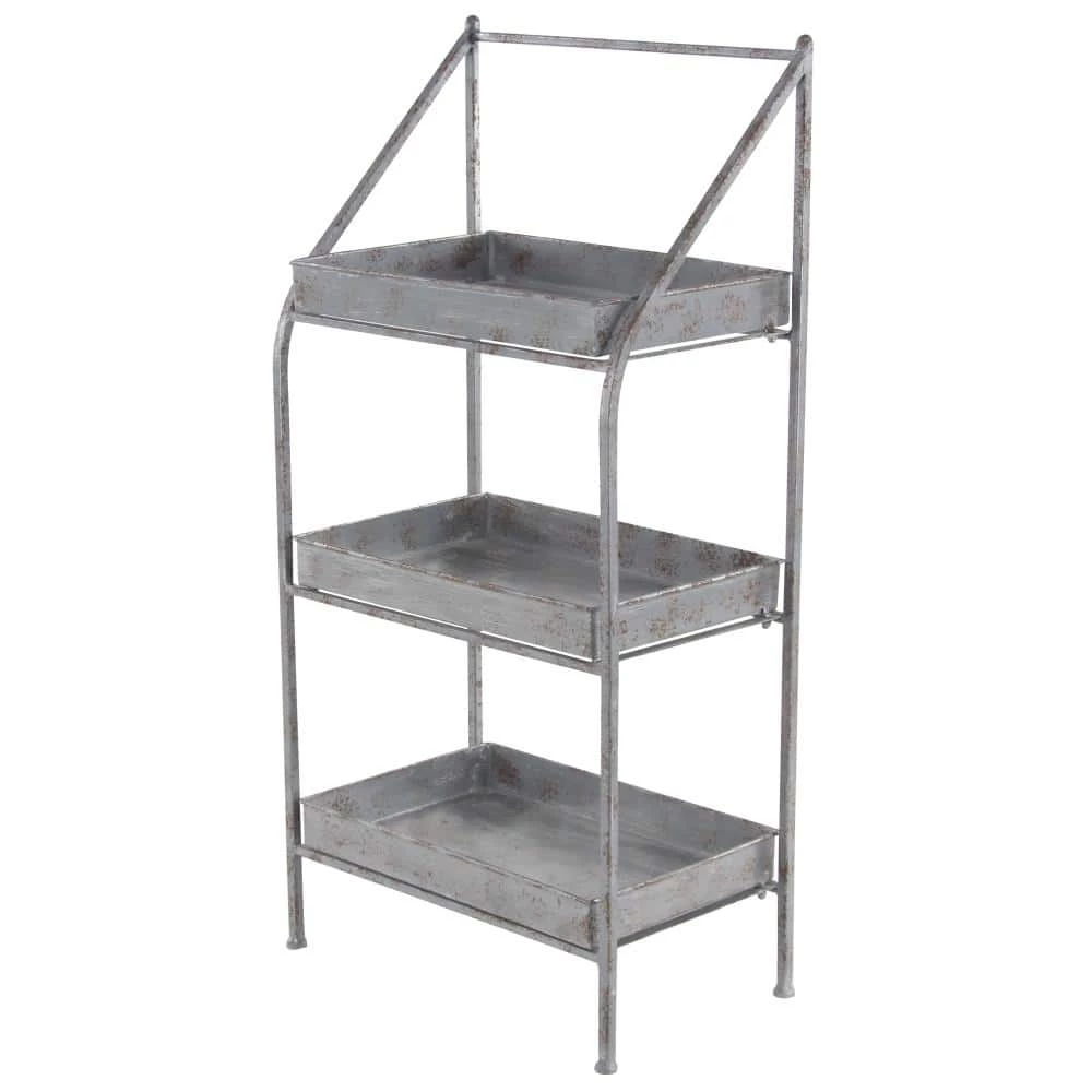 The distressed, metallic silver finish of this metal outdoor plant stand works with both industrial and farmhouse decor. The 3 solid rectangular shelves securely hold your potted plants and flowers and are removable for your convenience. Though simple in structure, the angled front bars with a soft curve add subtle, simple style to your outdoor garden patio, or indoor botanical space. This remarkable plantstand is ideal for both indoor and outdoor use and blends well with vintage and farmhouse-themed living spaces. Features sturdy footed legs with circular band braces. Wipe clean with a dry cloth. Suitable for indoor and outdoor use. Farmhouse-themed style. This item comes shipped in one carton. Maximum weight limit is 5 lbs. per shelf.